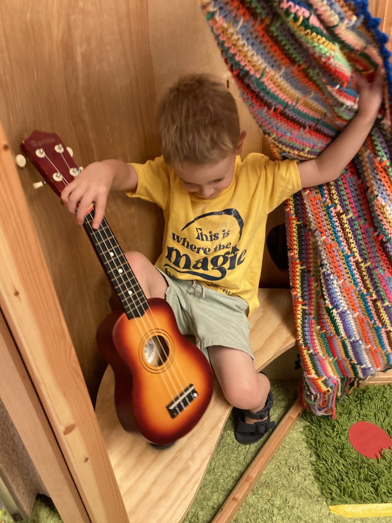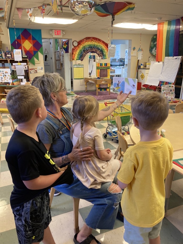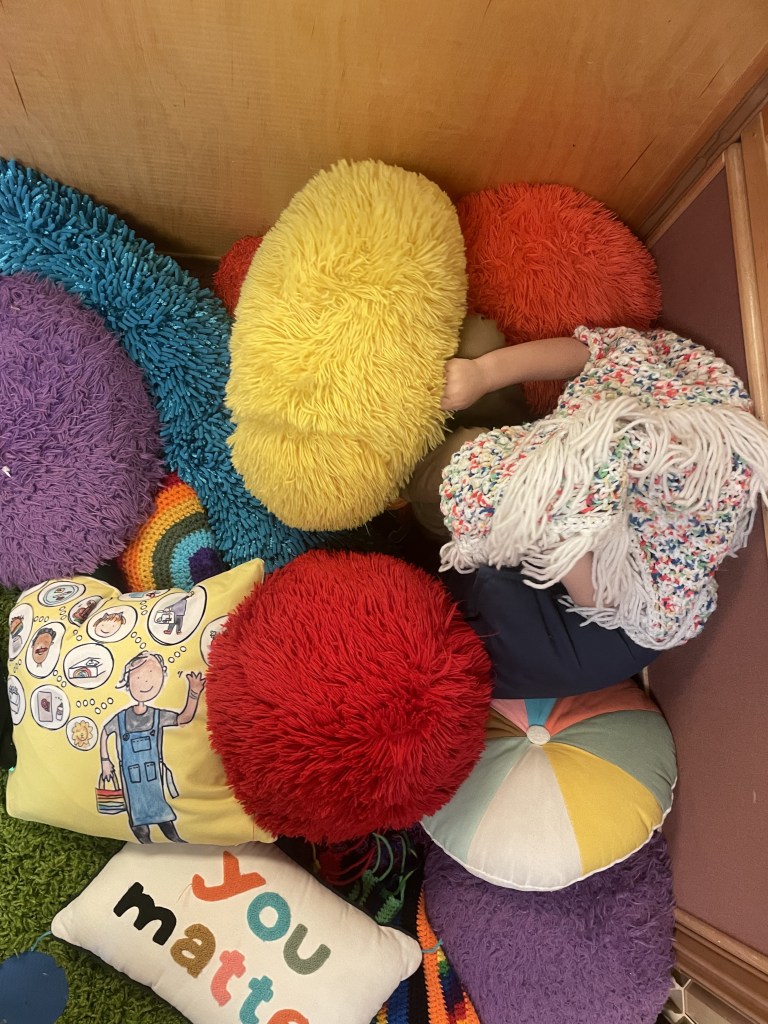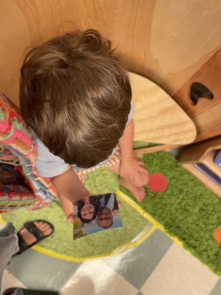 What do you do if you don’t want to sit at Circle Time? They can lay down, stand, get a pillow, etc. What is most important in this skill set is noticing what their body wants to do and honoring it. If a child is uncomfortable for any reason sitting “criss cross applesauce,” I want them to move and adjust. We have several cozy corners children can retreat to anytime….one friend brought a photo of his mom and dad with him: