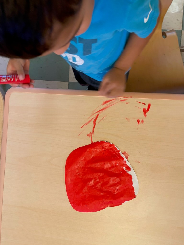 On our second day of the school year, we continued to explore what it means to “Honor our impulses” (see the segment below) and make connections between apples, eating, drinking, digestion, going to the bathroom, etc. Today we talked about our apple preferences, found our afternoon Golden Letter friends and played hard inside and outside (including finding a lot of Golden Rain Tree bugs)! We painted more apples-some to take home and some on the easel for a school project.