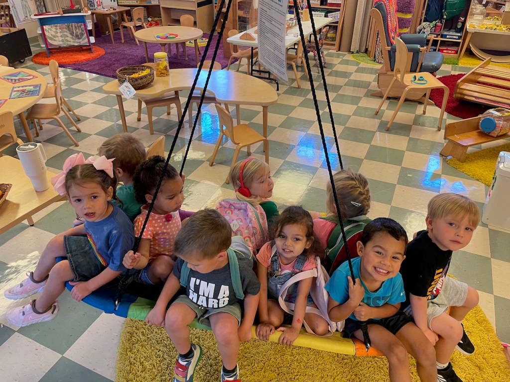 One of the favorite spots in our classroom is our indoor swing. While sometimes the swings are for solitary time, today they were for more than one at a time (in the morning class all but 3 friends wanted to get on at once!). It’s a great opportunity to notice what our bodies want and need (faster? slower? too crowded? enjoying being squished?).