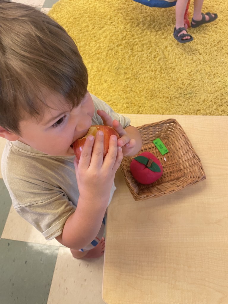 This week we are exploring what it means to “Honor our impulses” (and make the connection between apples/ eating/drinking/bathroom/etc). In the first week of school what I want most is for children to feel safe in getting their basic needs met. For instance, they are allowed to get a drink of water, go to the bathroom, take shoes on and off and change positions whenever they like. In this first week of school we will be introducing all the ways that these needs can be met with or without teacher assistance. It is vitally important that children learn to identify their body’s needs and I have complete confidence that by honoring their body’s impulses now, they will be better suited to respond to social norms/expectations as they age (in other words: they do not need to be forced to sit still now so that one day in 2nd grade they will be able to).