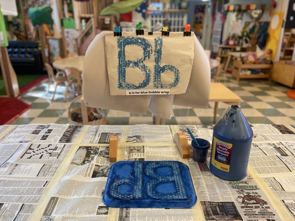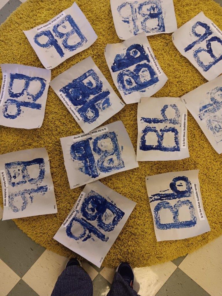 Blue (there was light blue, dark blue and darker blue)! Our Alphabet Art Project is basically a tongue twister: Blue Bubble wrap B prints. Children painted on top of the bubble wrap Bb shapes and then made prints by gently pressing and rubbing paper on top of it.