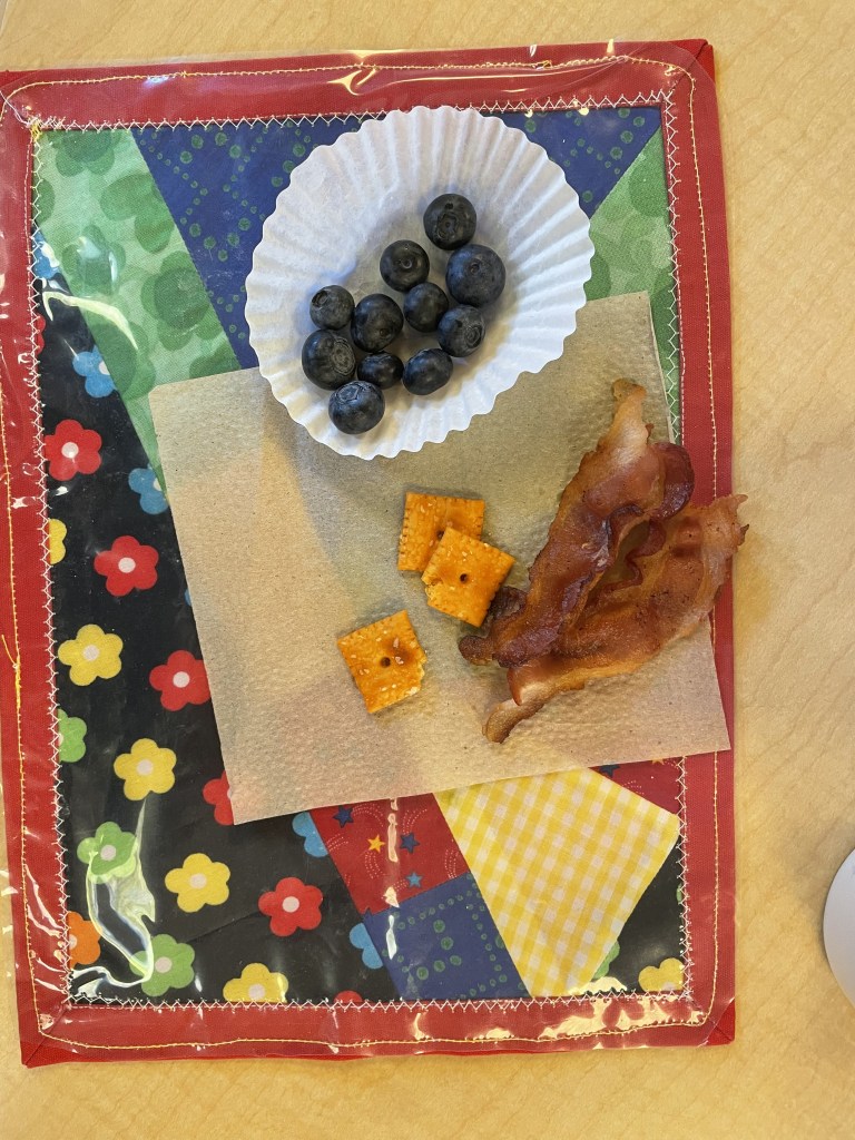 In the morning we had Bacon and Blueberries from Ruthie and Bright orange cheese crackers from Sophie! It was very exciting to find big blueberries and blueberries with the stems still on. Thank you, friends!