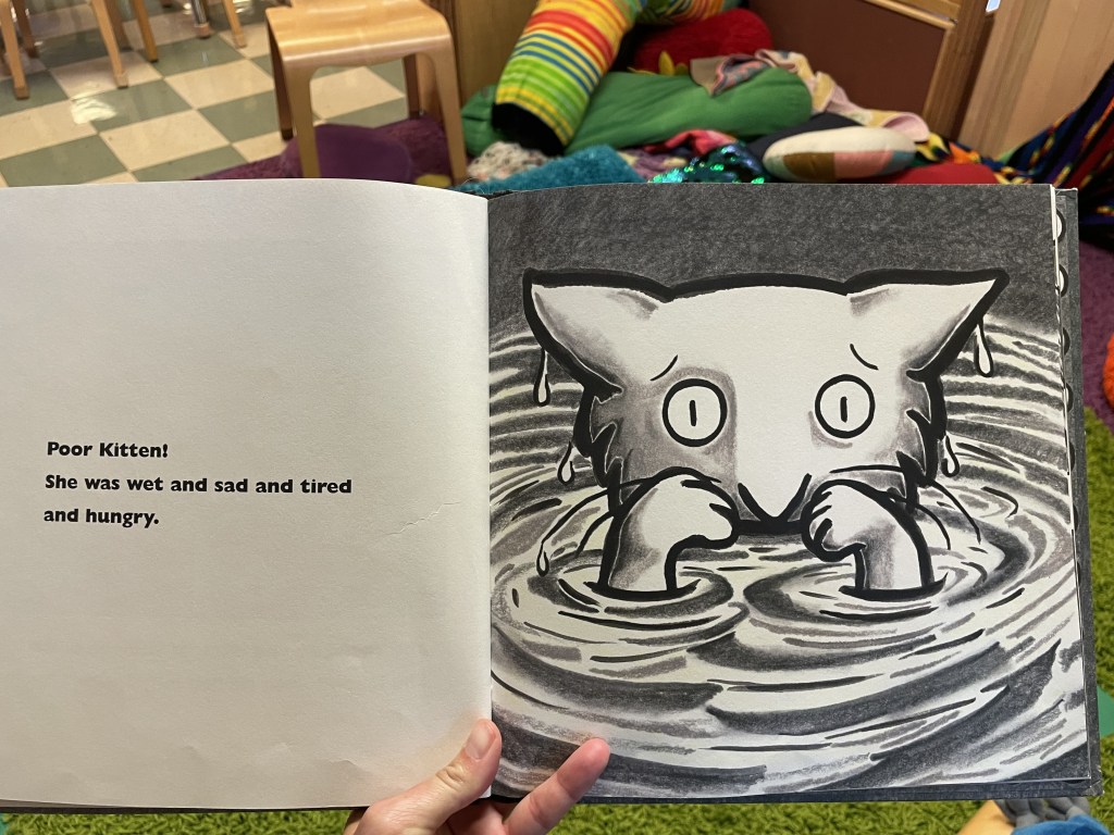 Our Story Time book for the week is Kitten’s First Full Moon by Kevin Henkes. We have our own preschool copy but it is also available at our local library…in English and Spanish..La Primera Luna Llena de Gatita.