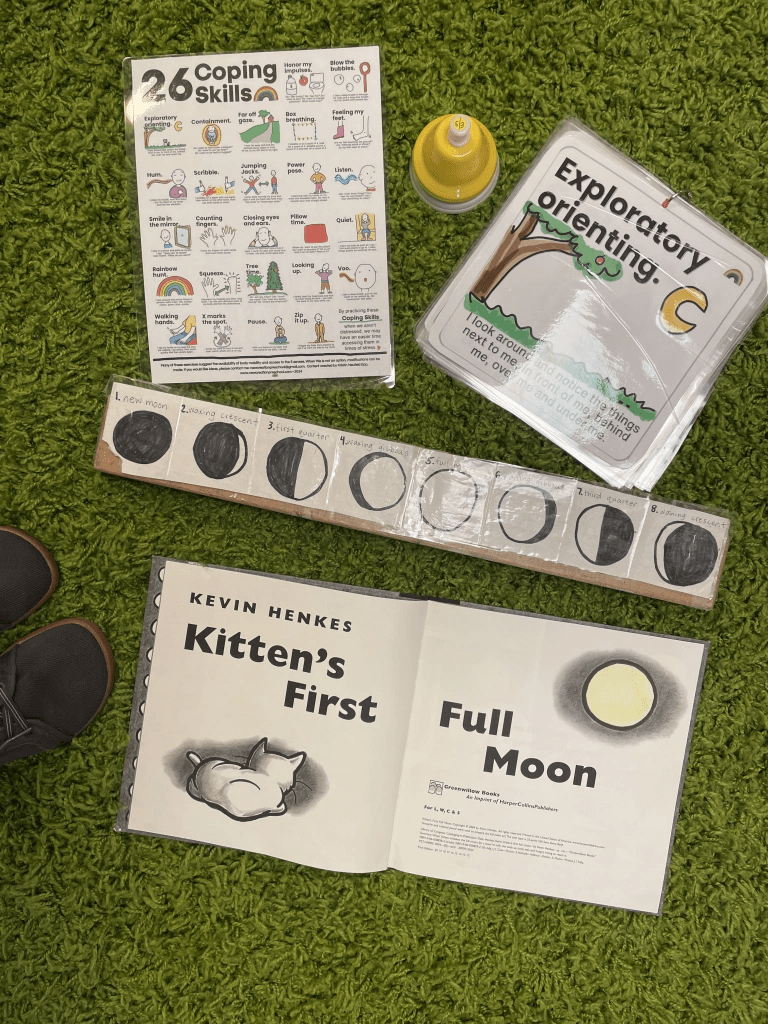 This week we are practicing exploratory orienting (just like a curious cat looking for her bowl of milk and finding the moon, little bugs, trees and her own porch). In keeping with this theme, we have cat, cloud and car activities…all of these are easy jump off points for exploratory orienting. Read more in the Coping Skill section below. This is described as relaxed alertness to both internal and external environment, curiosity and gathering information about the environment with a low level of activation.