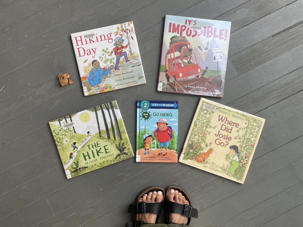We have several Story Time books this week all from our local library (I will return them after this week so you can check them out too!): Hiking Day (Rockwell), It’s Impossible! (Cordouroy), The Hike (Farrell), Hiking (Reagan) and Where Did Josie Go? (Buckley). The books all show the experiences of children and animals looking at things both close up and then taking in the wide open spaces. You can find out which your child likes the best!