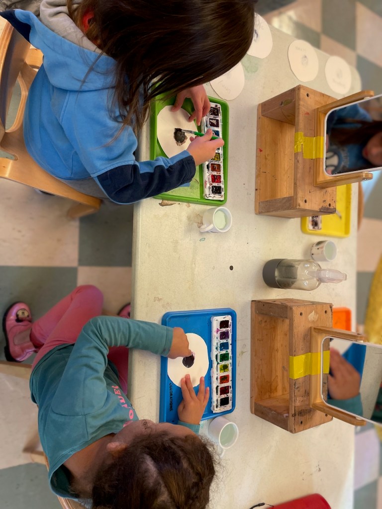 Watercolor Eyes: children finished up their crayon resist experience with watercolors this week while looking in mirrors at their own eye colors. The crayon is drawn on first and then watercolor painted on top. The watercolor doesn’t stick as well to the waxy crayon which is the “resist” part.