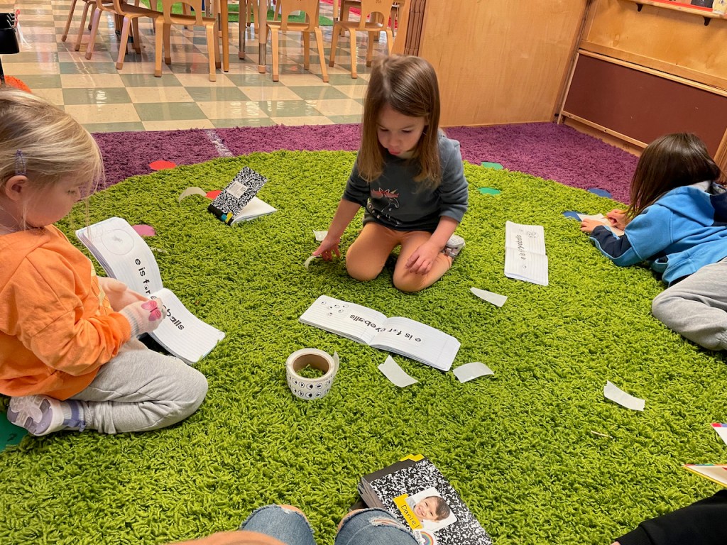 Googly Eye sticker work: As a continuation of last week’s dot sticker work, children peeled more small stickers to place in their journal…these look like googly eyes. This requires a high degree of fine motor work…more than many of us realize!