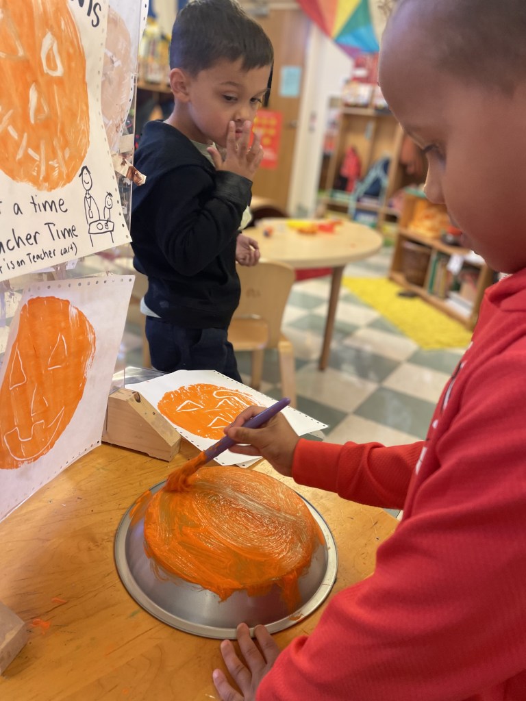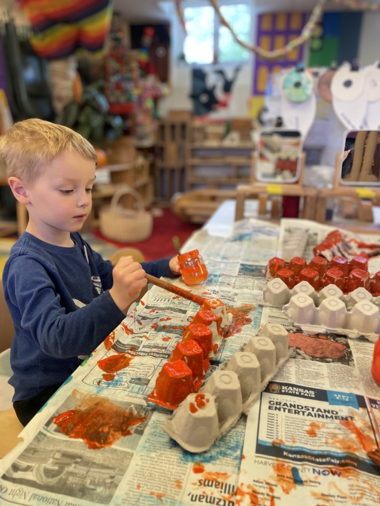 Egg Carton painting: we started painting cardboard egg cartons orange in preparation for a pumpkin project next week! Given the 3D nature of egg cartons, more dexterity and problem solving is used to get in the nooks and crannies.