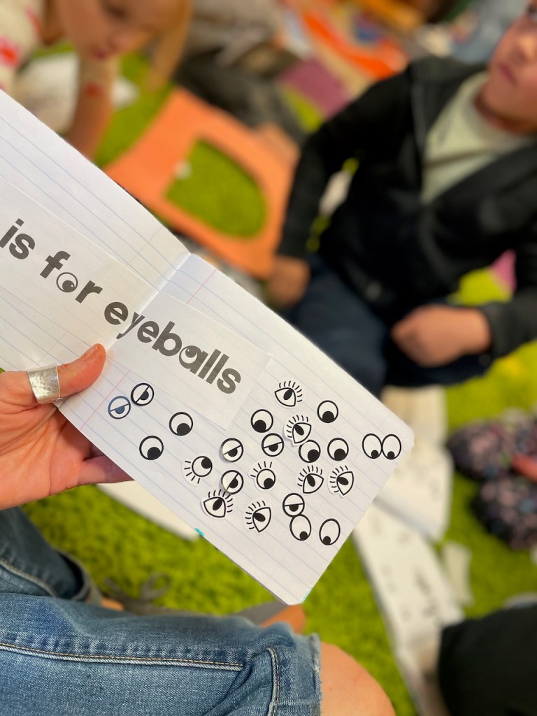 Eggy the Egg E: We’ve affectionally given a silly name to this week’s cardboard E. Covered in egg cartons and painted with watercolors, they will get their eyes on Thursday once the paint dries enough!