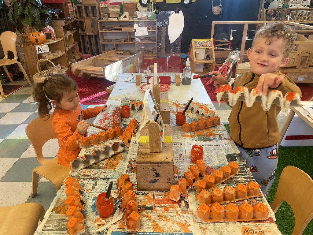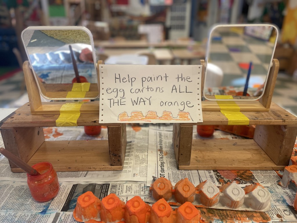 Egg Carton painting: we finished painting cardboard egg cartons orange in preparation for a pumpkin project next week! Given the 3D nature of egg cartons, more dexterity and problem solving will be used to get in the nooks and crannies.