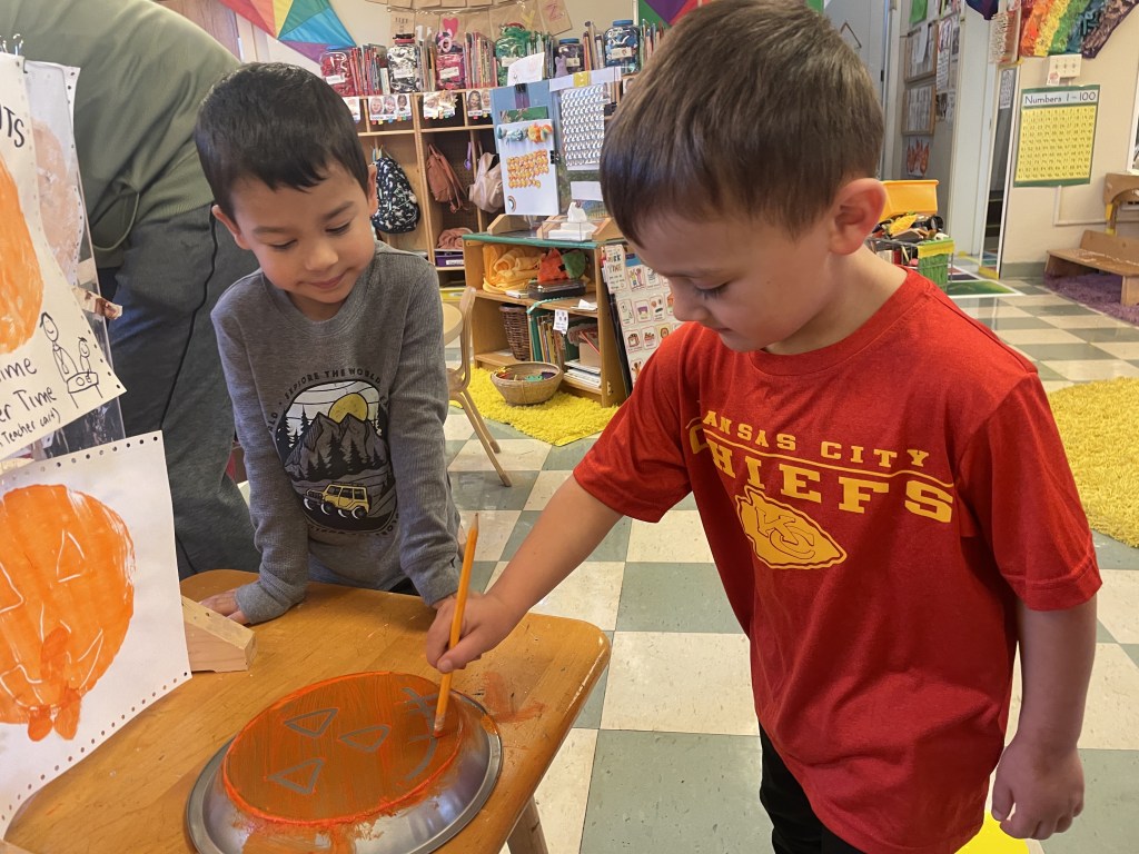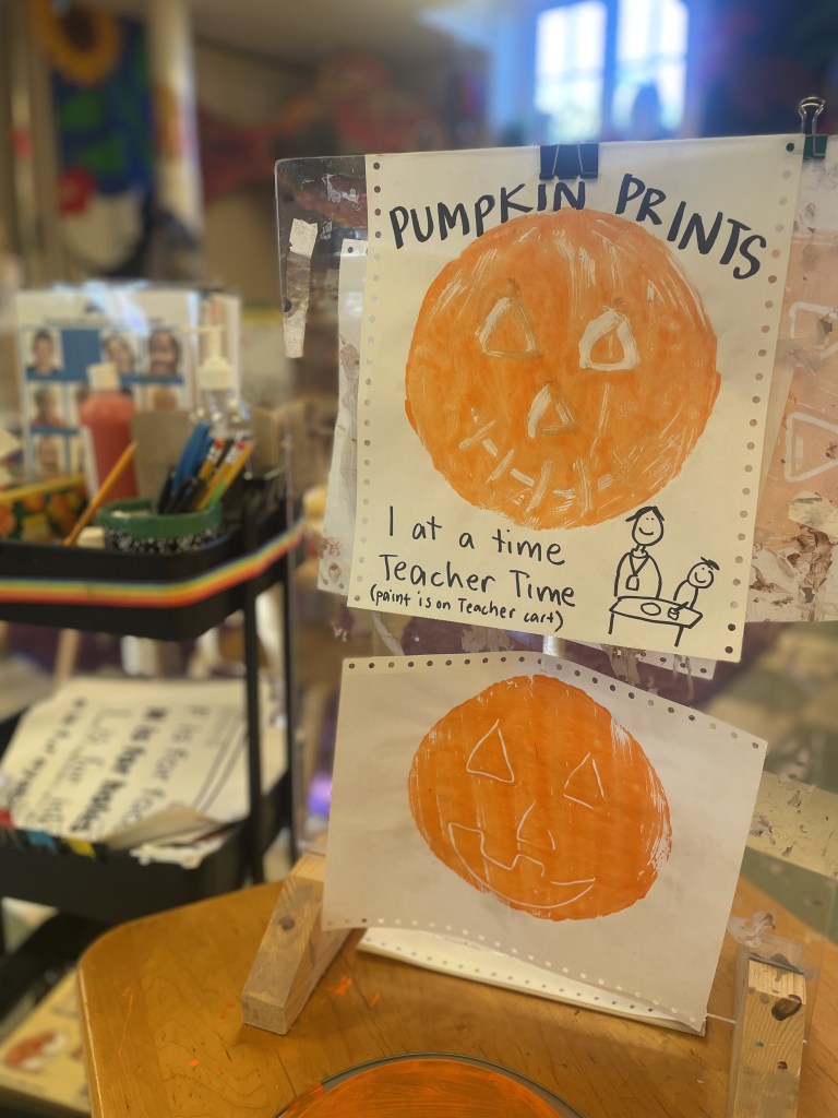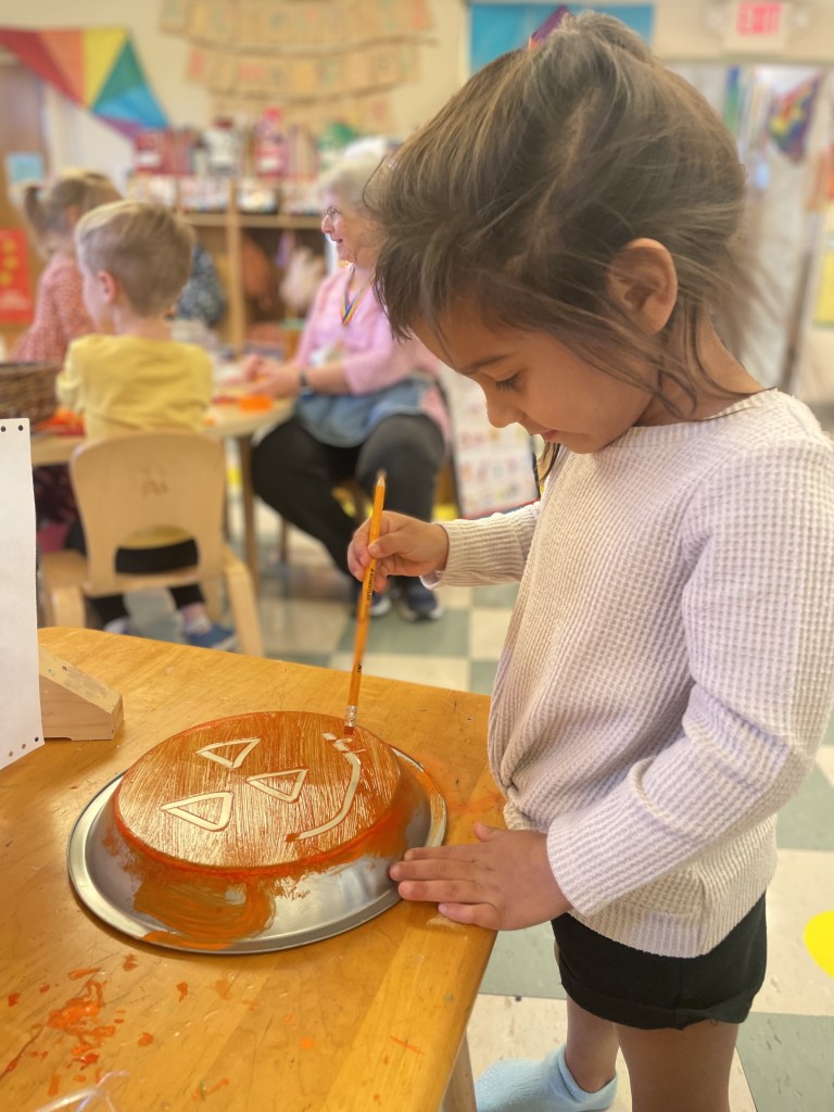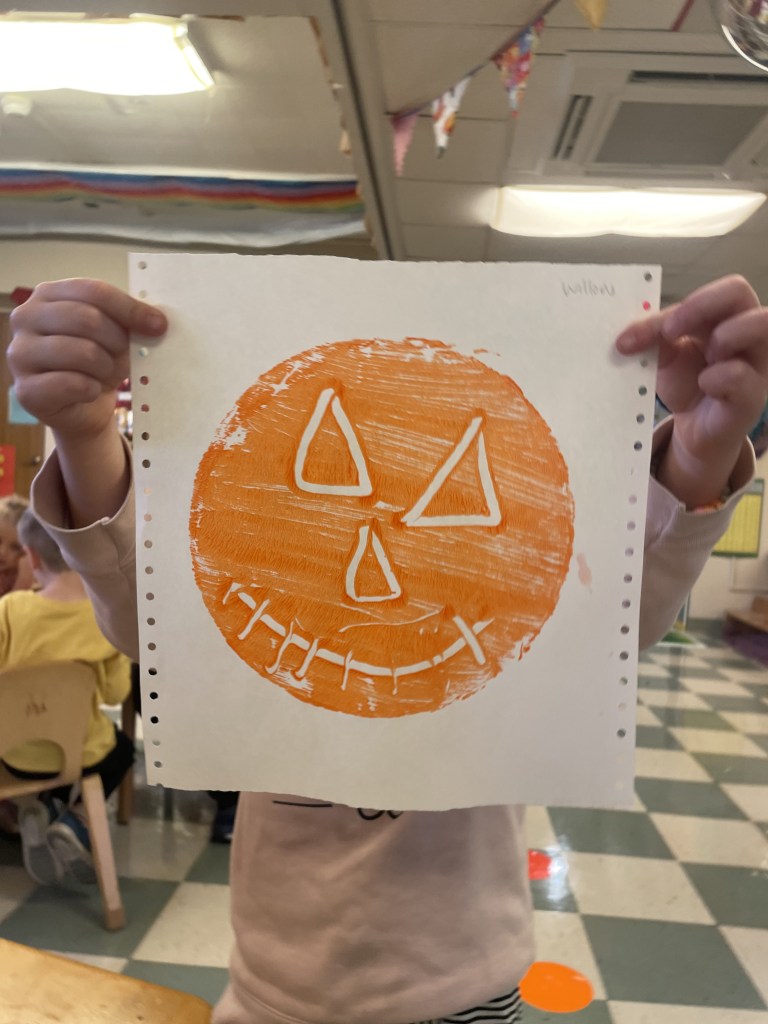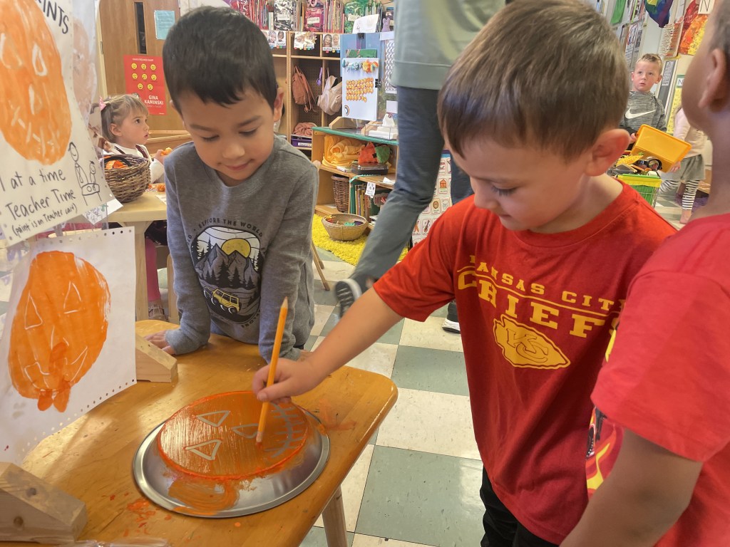 Pie Pan Pumpkin Prints (too bad it’s not P week lol): Everyone was invited to make a a pumpkin print. This involves painting on the bottom of a pie pan, using a pencil eraser to draw facial features and then making a print with gentle patting. They are so fun.