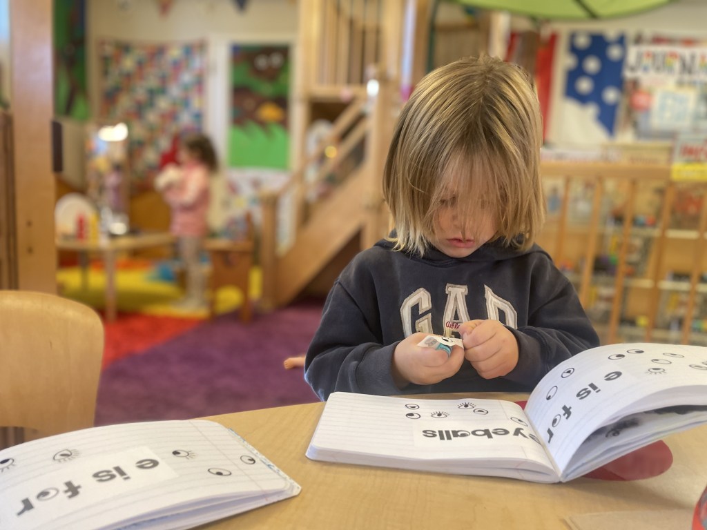 Googly Eye sticker work: As a continuation of last week’s dot sticker work, children peeled more small stickers to place in their journal…these look like googly eyes. This requires a high degree of fine motor work…more than many of us realize!