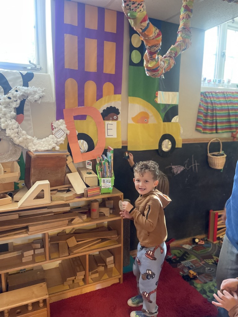Eggy the Egg E: We’ve affectionally given a silly name to this week’s cardboard E. Covered in egg cartons and painted with watercolors, they got their eyes today once the paint dried enough! Given how the other Alphabet Friends are entering play, it was fun to see Eggy at the Snack Table before they even got their eyes!
