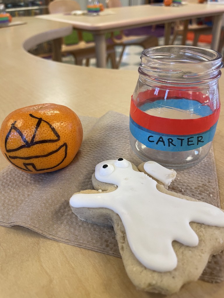 In the afternoon we had ghost cookies made by Annie’s mama and oranges turned into pumpkins by Annie’s mama. We said thank you to Annie and her mama. Then Malcolm brought us chips, fruit and fruit circles which he calls pepperoni. What a snack time!