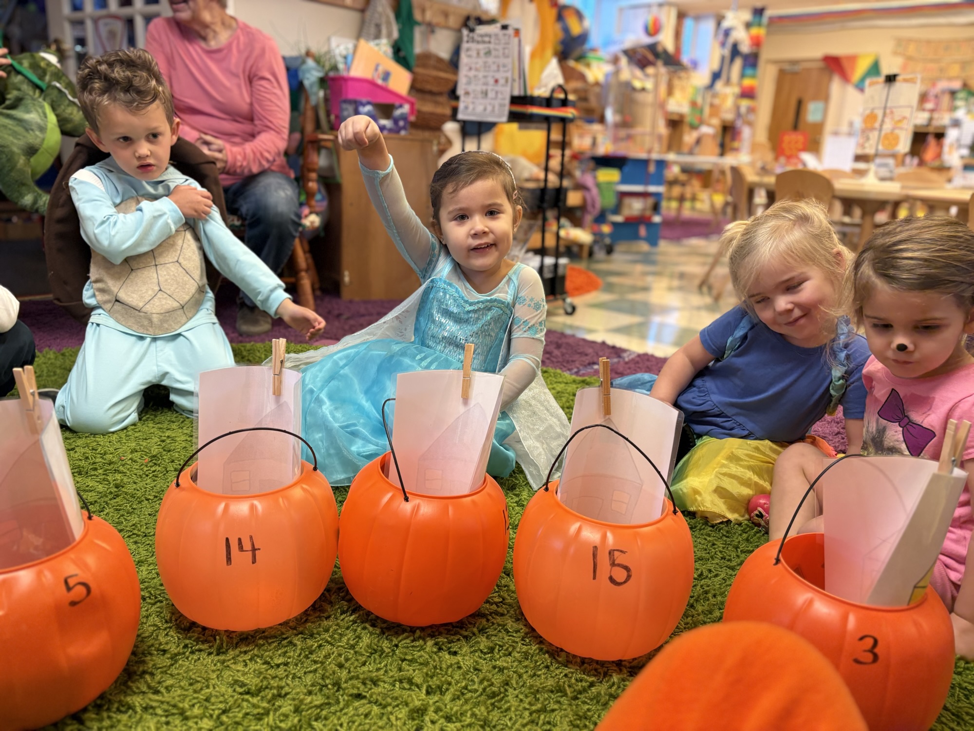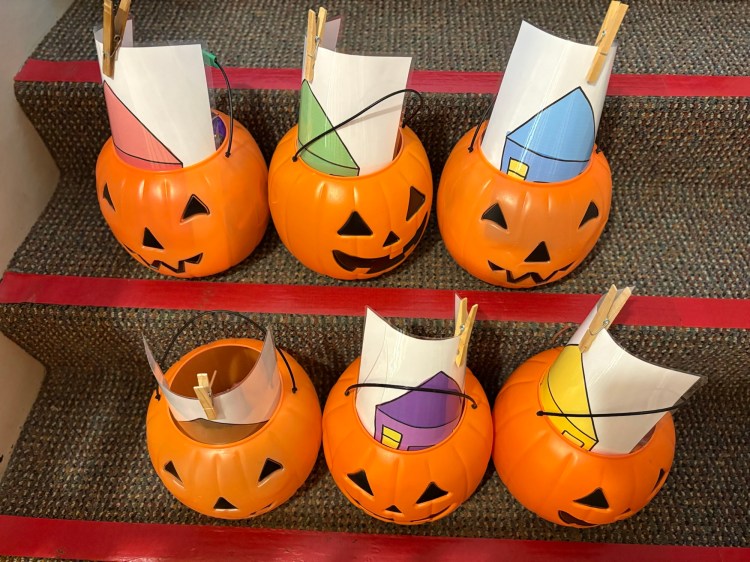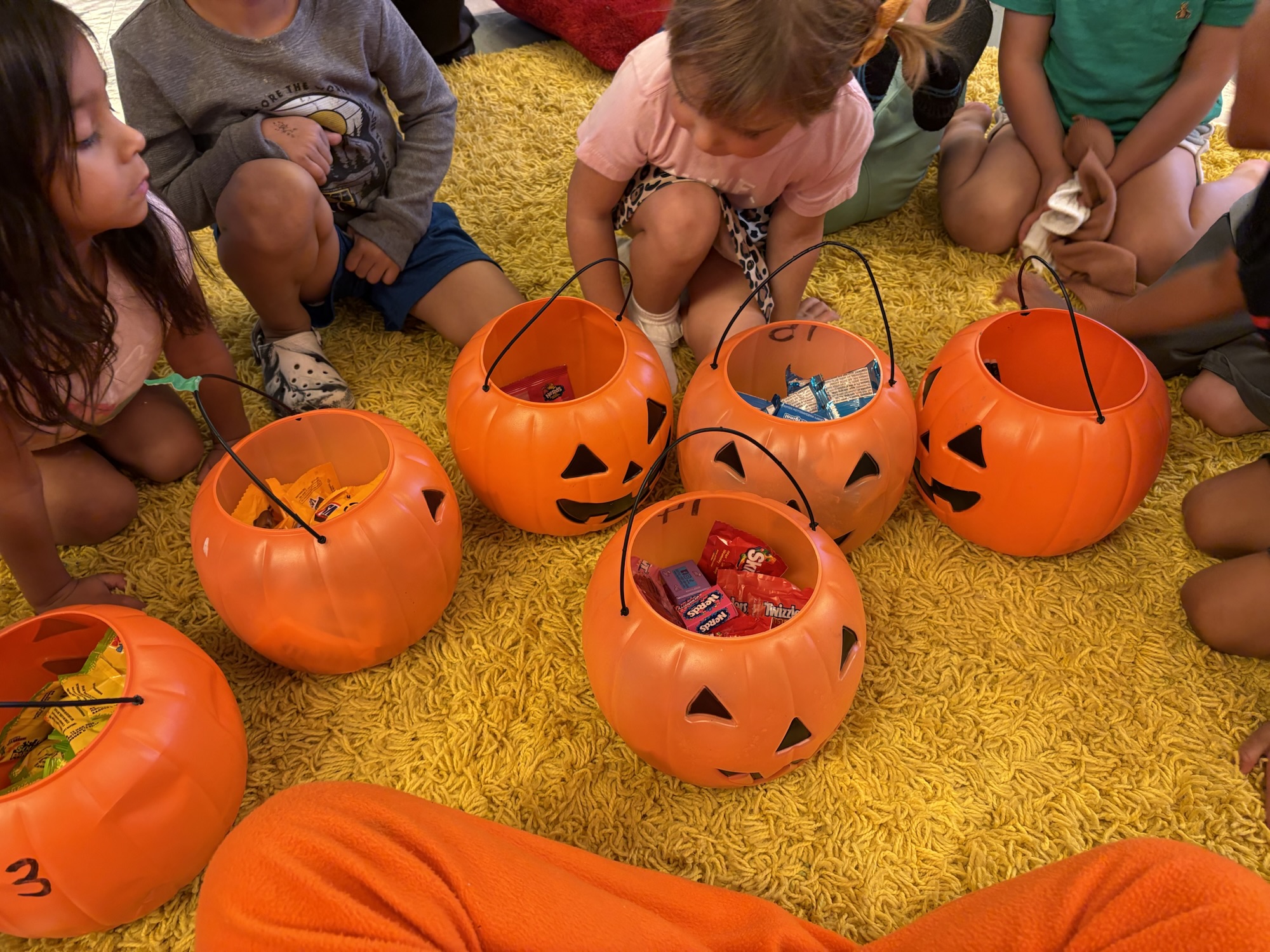 6! We will use these outside when we practice Trick or Treating. Thank you, families for bringing us candy and treats! We are ending each day with Trick or Treat practice. Day number one included a lot of coming back to the teacher and calling out thank you. Well done, kids!