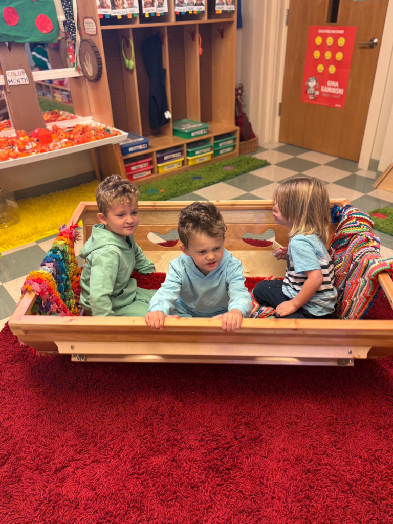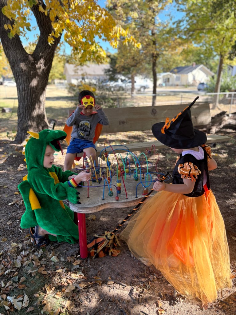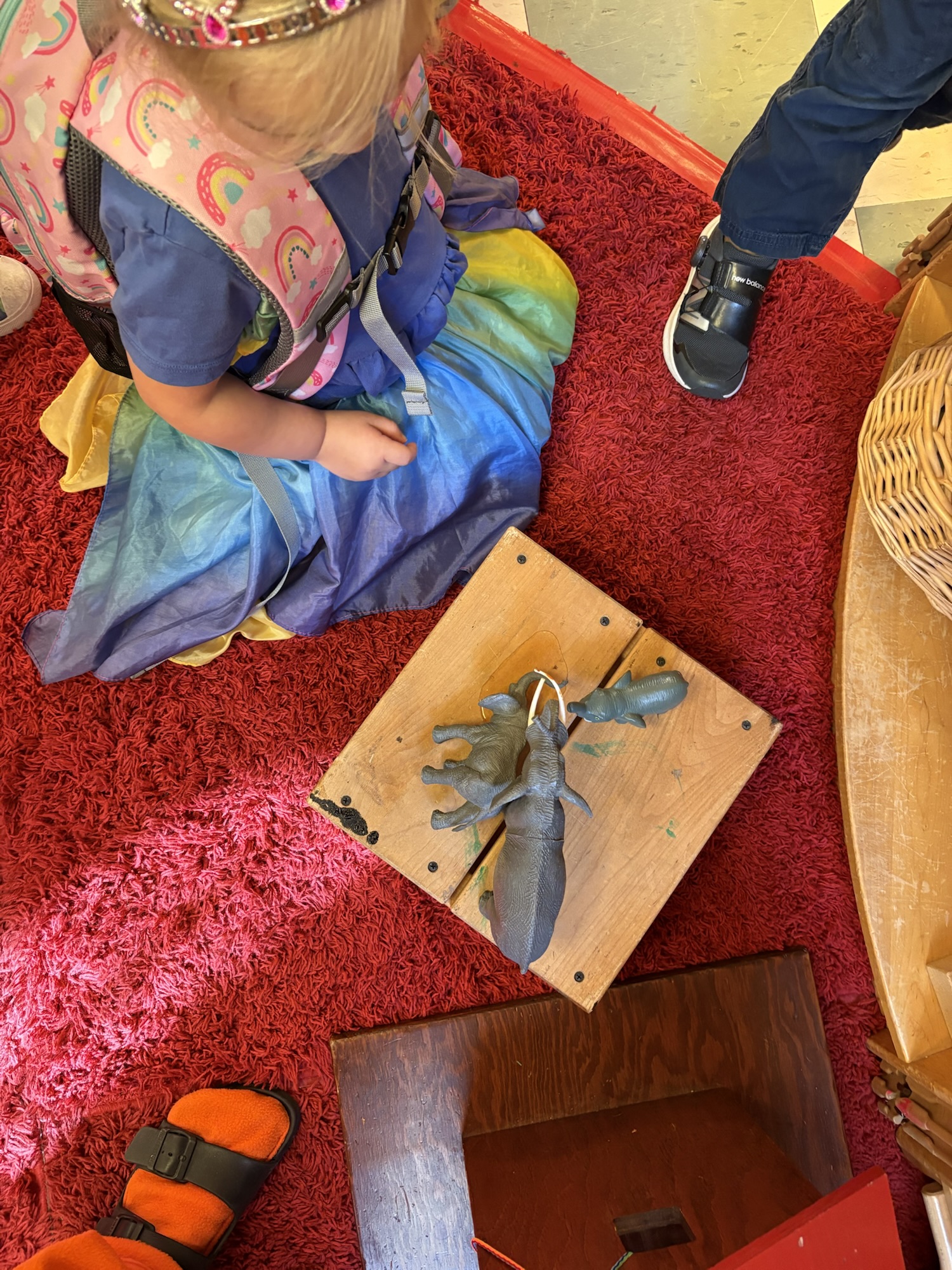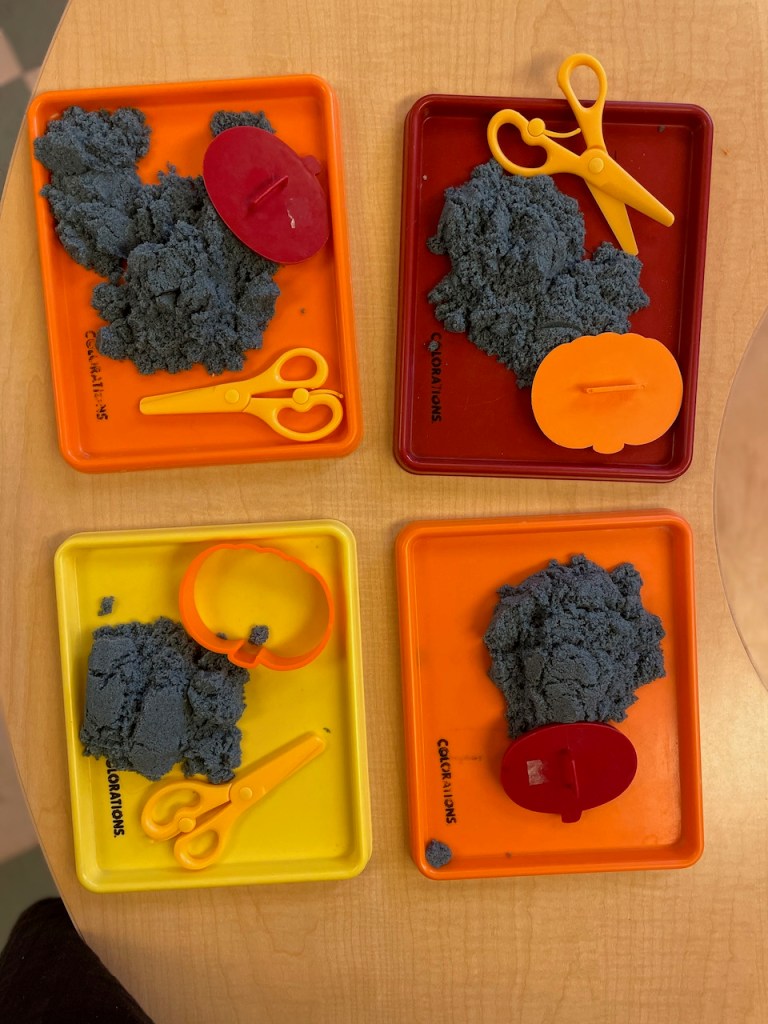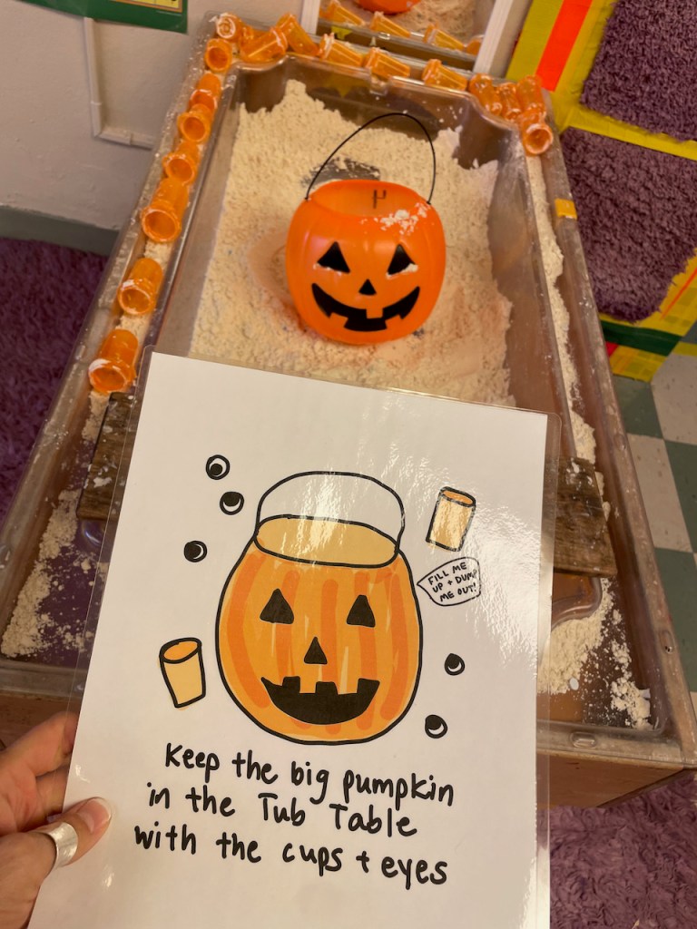 Pumpkin play: Ms Kristin did some pumpkin rearranging work. The little pumpkins moved to the Water Table, a big pumpkin went in the Tub Table (fill it up! dump it out!) and the pumpkin cookie cutters aren’t with the playdough but there are with kinetic sand. The pumpkin swing has a new plan: 2 at a time if someone wants to navigate it with a friend. Whew!