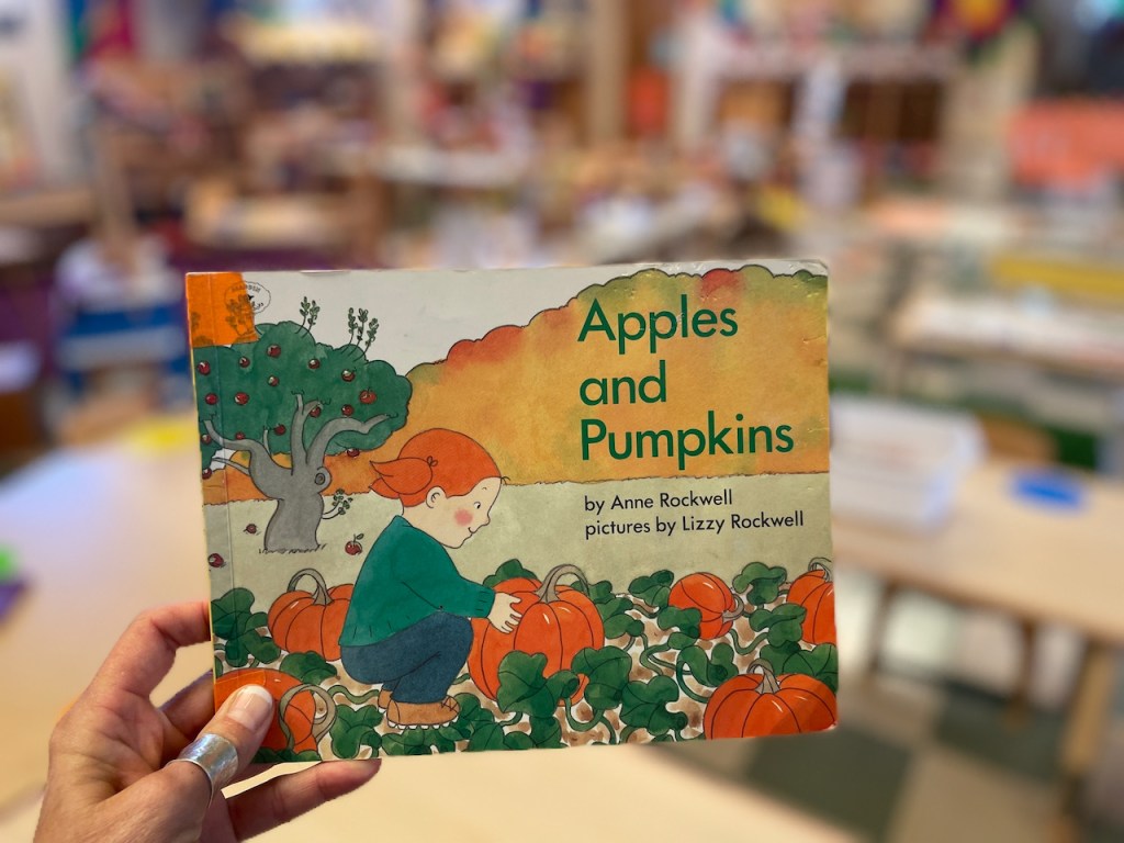 Our main Story Time book is Apples and Pumpkins and it is at our local library. We also have a couple of copies including a Big Book format. This book gives us the opportunity to remember A Week when we worked with apples. There are also some “danger” pages I’m sure you’ll hear about.