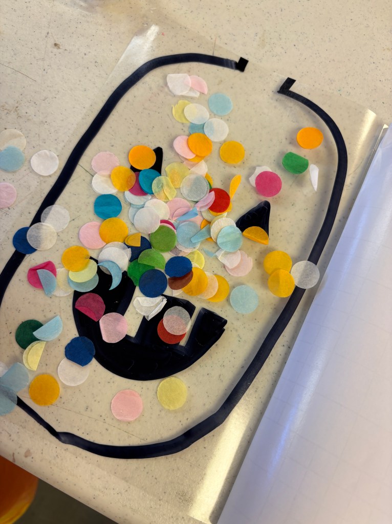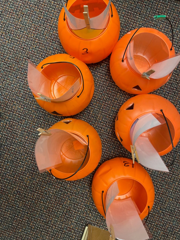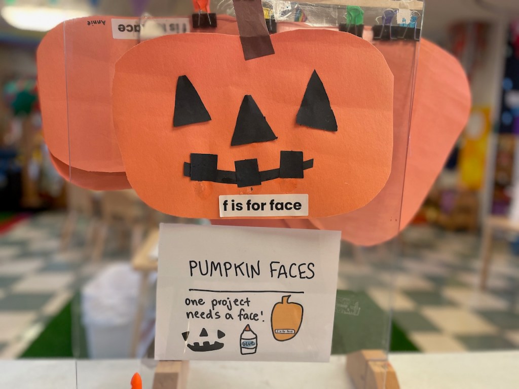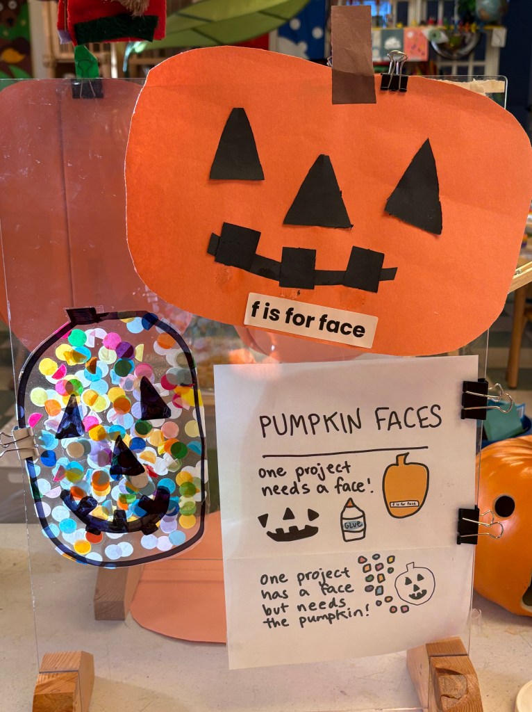 Pumpkin face sun art: Today we started this project which had the pumpkin face but no pumpkin…the opposite of our other pumpkin face project! Children add tissue paper to the sticky side of clear plastic (these are self sealing laminating sheets but could also be done with contact paper like it’s 1999). When put against a window they are so pretty!