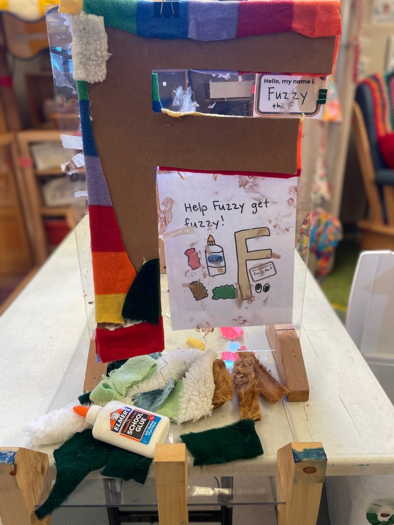 Fuzzy the F: Oh Fuzzy I predict you may be a favorite Alphabet Friend because you feel so soft (we took turns touching with a gentle pat today). Lots of glue is being used to get the variety of furry and fuzzy fabric to stay.