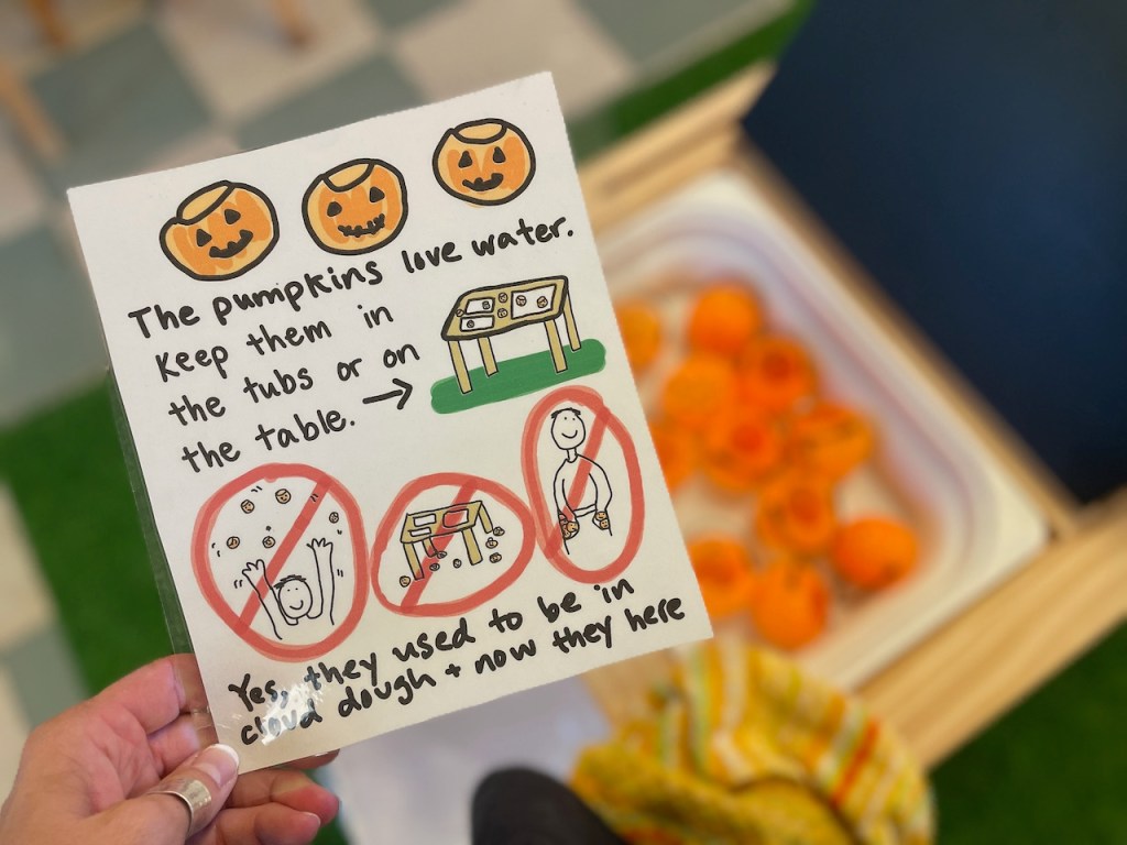 Pumpkin play: Ms Kristin did some pumpkin rearranging work. The little pumpkins moved to the Water Table, a big pumpkin went in the Tub Table (fill it up! dump it out!) and the pumpkin cookie cutters aren’t with the playdough but there are with kinetic sand. The pumpkin swing has a new plan: 2 at a time if someone wants to navigate it with a friend. Whew!