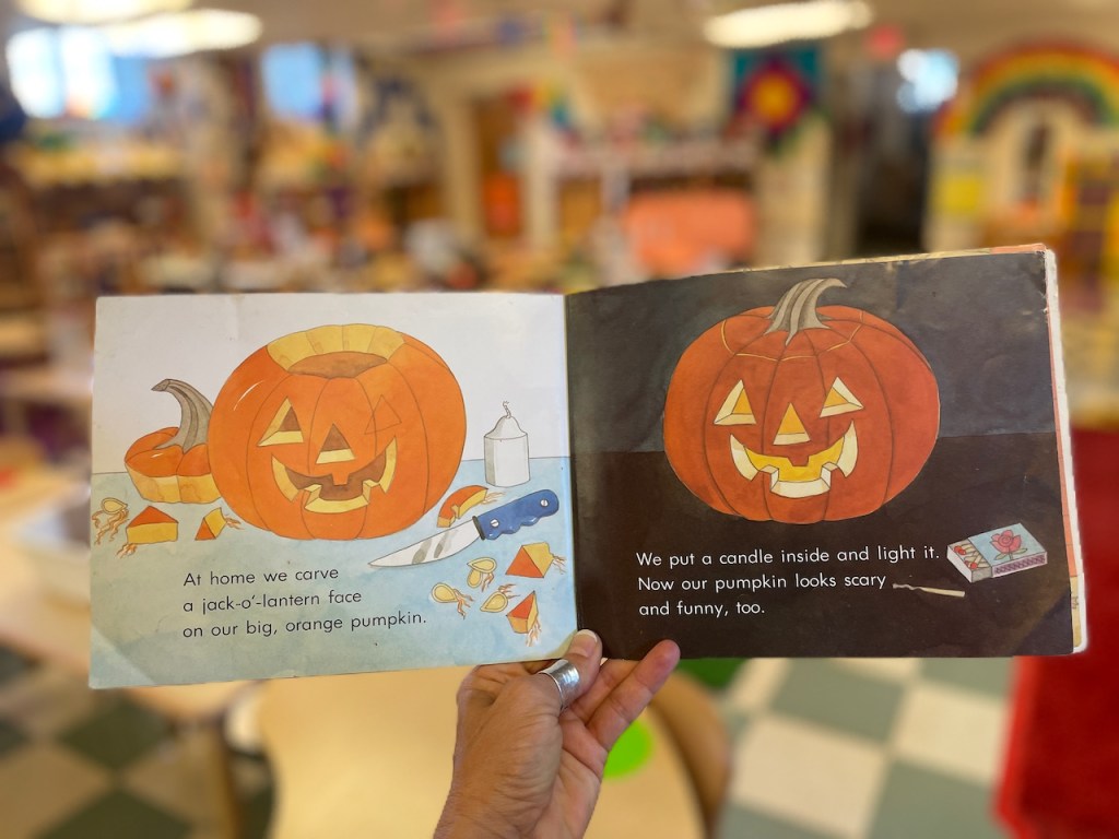 Faces on Pumpkins: Since children are invited to come in costumes this week, paint and markers are limited. For our art work this week we’ll only need paper and glue to turn a pumpkin into a jack-o-lantern just like in our book.