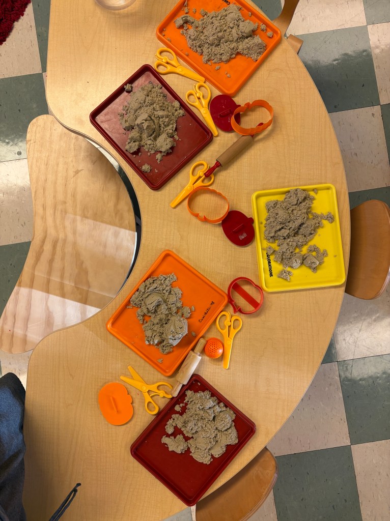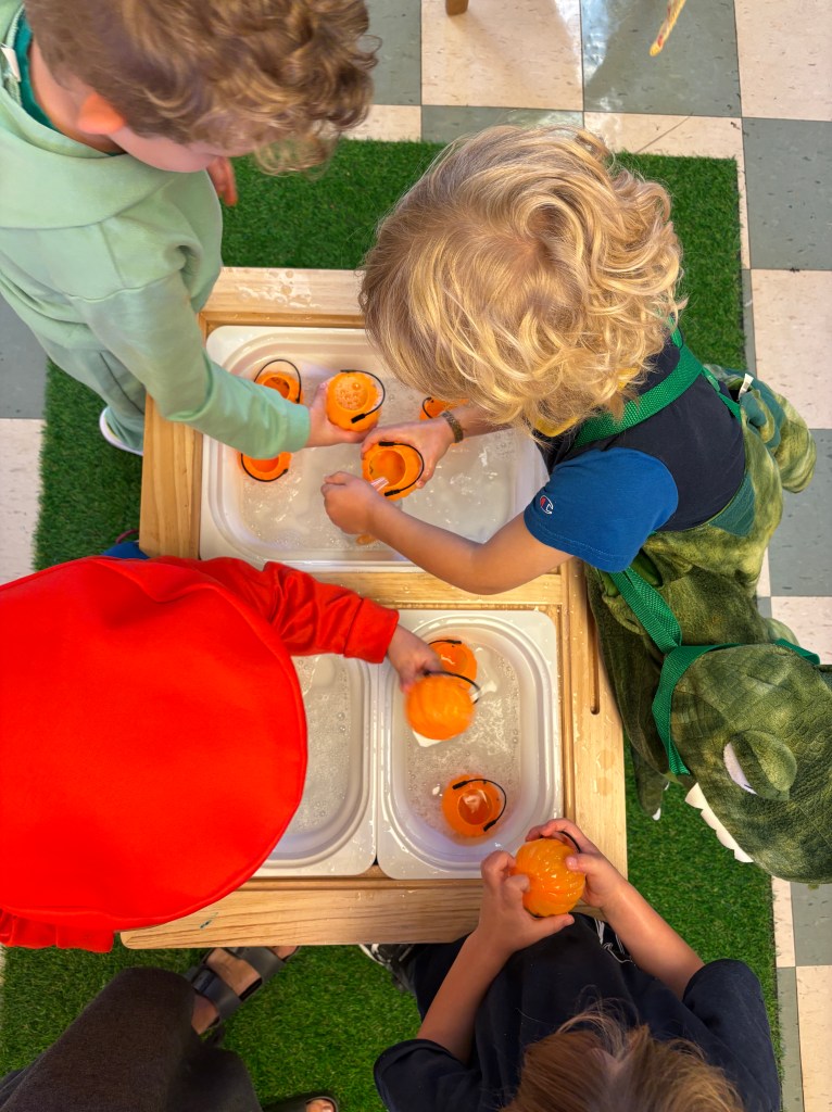 Pumpkin play: Ms Kristin did some pumpkin rearranging work. The little pumpkins moved to the Water Table, a big pumpkin went in the Tub Table (fill it up! dump it out!) and the pumpkin cookie cutters aren’t with the playdough but there are with kinetic sand. The pumpkin swing was higher today which gave even more spinning room.