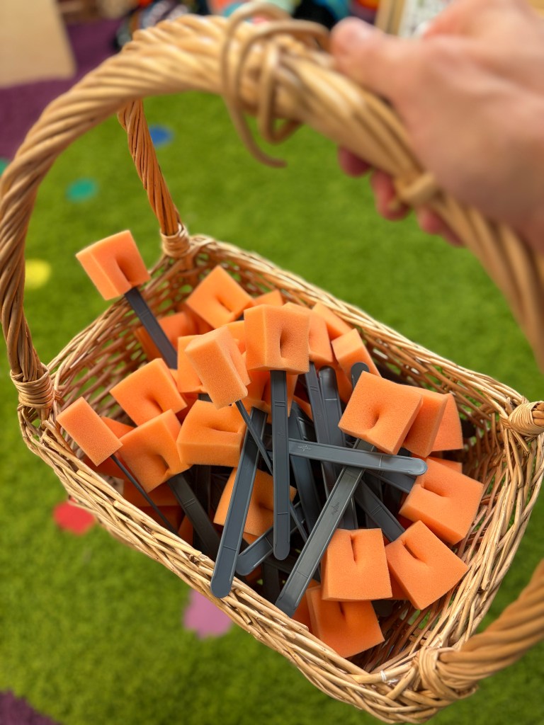 We had more than enough sponge wands (57!) from one of Ms Kristin’s friends who works at the hospital for everyone! The orange paint on our egg cartons was dry and they turned into pumpkins too. I’m so disappointed that I didn’t get all preschoolers in the frame (I thought I did)…but believe me we were all there and had a fun time performing for the camera using props! We’ll do more shows in the future!