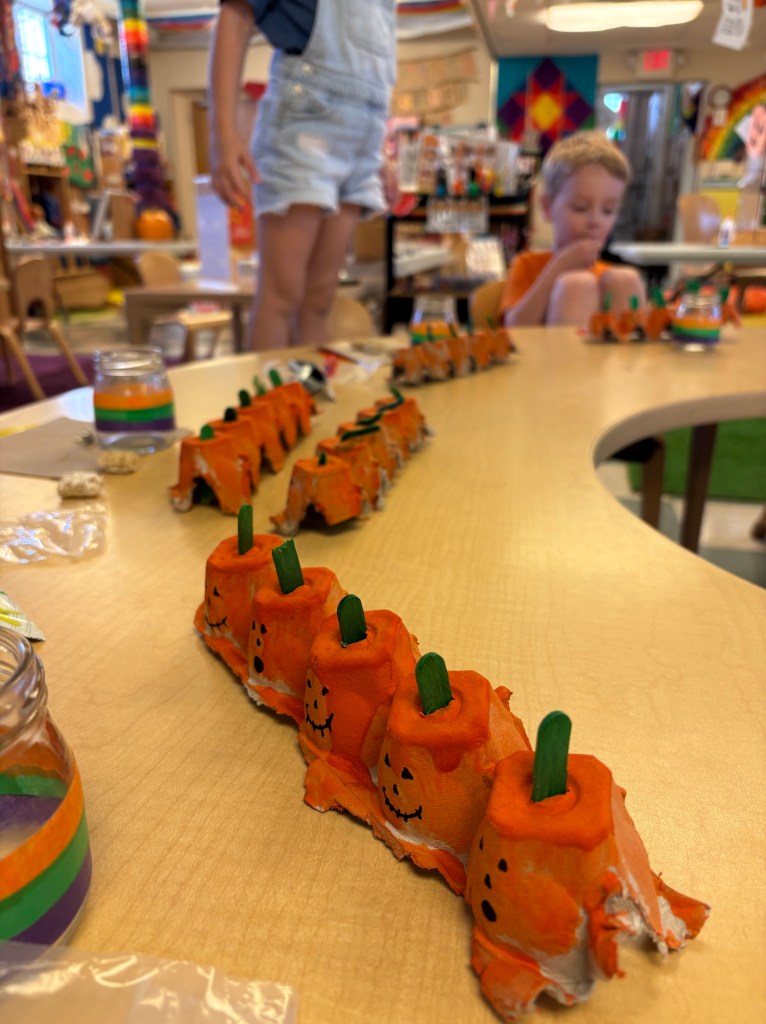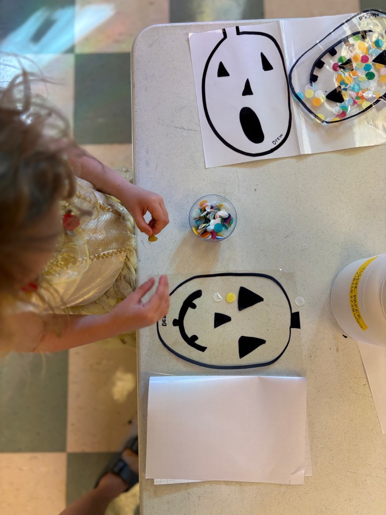 Pumpkin face sun art: This project had the pumpkin face but no pumpkin…the opposite of our other pumpkin face project! Children added tissue paper to the sticky side of clear plastic (these are self sealing laminating sheets but could also be done with contact paper like it’s 1999). When put against a window they are so pretty!