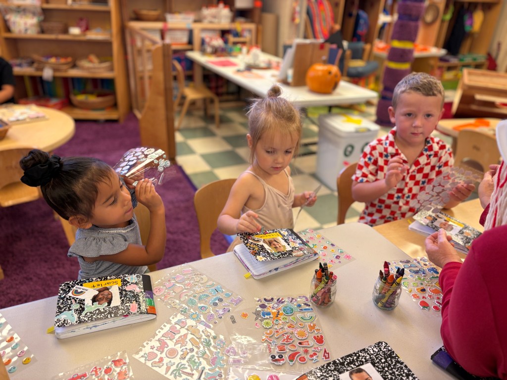Face drawing: Our Journal Time invitation is to make a face. Remembering the wide range of development when it comes to drawing faces, this is a fun project to observe. We also brought out fun stickers to decorate our journals inside and out.