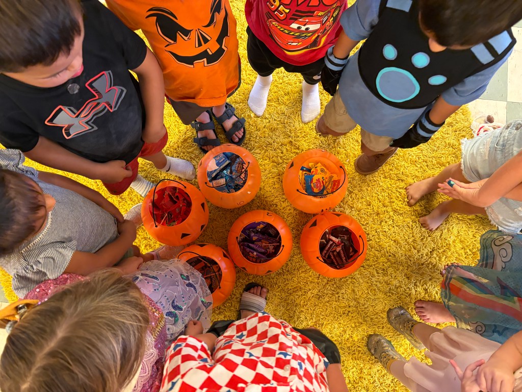 Playground Hay Bales and Gourds: I am so grateful for Ms Brenda, Grandpa Kelven and Stutzman Greenhouse: we have a new circle of hay bales and enough gourds for each child! What a fun gift and tradition. We really enjoyed having them as our Meeting Place before practicing Trick or Treating on the playground! Today’s Trick or Treating had a great focus on the different colors of candy packages and our houses.