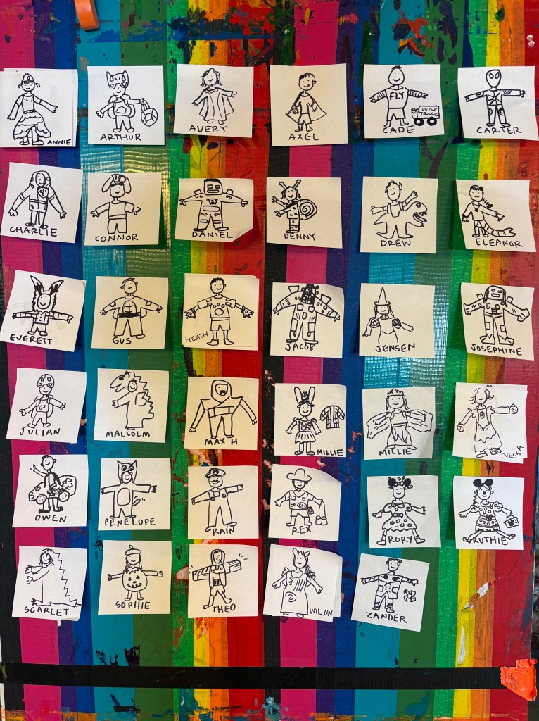 If you’ve been around this preschool for any number of years you may know that every year (since at least 2010 when I started this website!) I draw pictures of the children in their costumes…children don’t have to wear or even have their costume along for me to draw, I follow directions as best I can. These will stay up for us to enjoy and eventually go into their journals to keep forever.