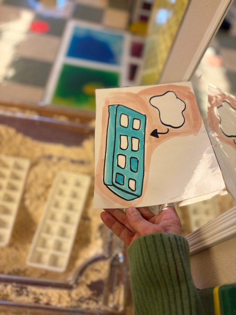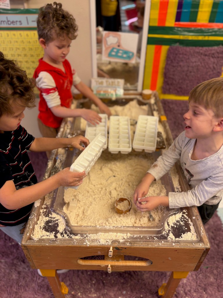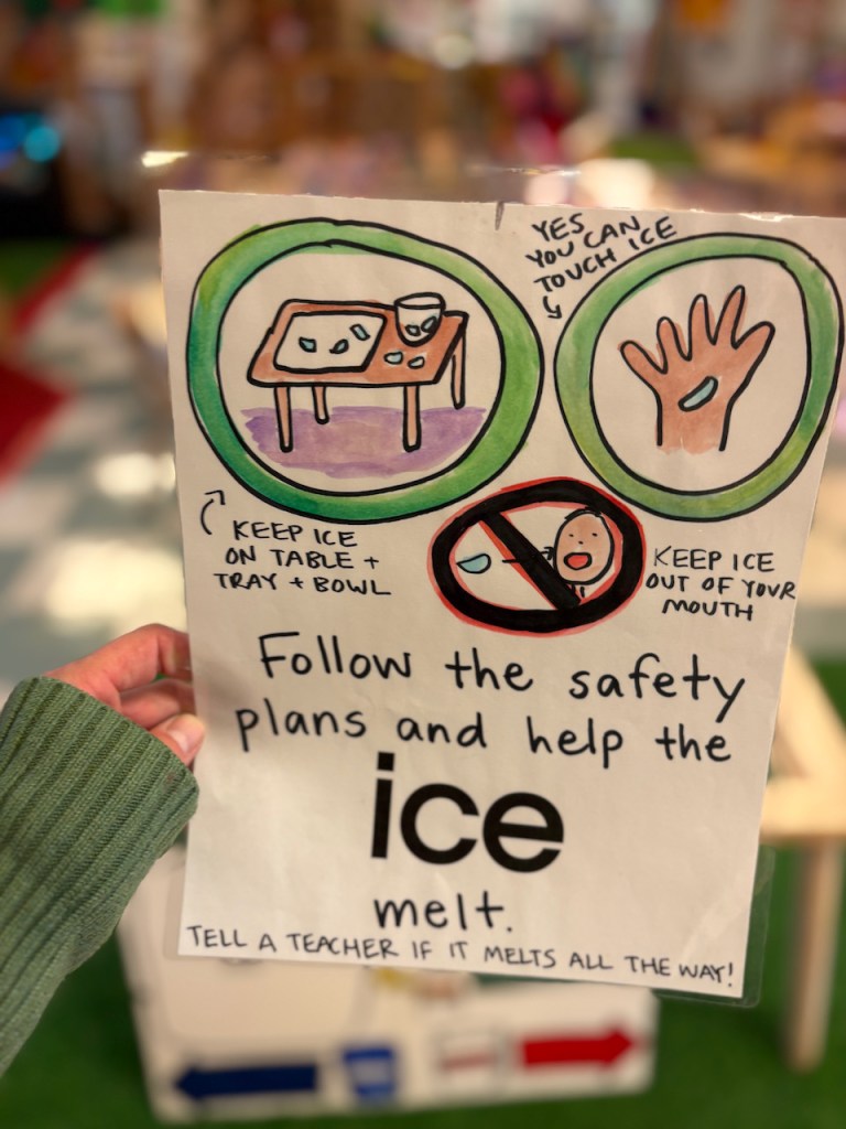 Ice Play: we have ice in the Water Table this week to hold, feel, observe and try to get it to melt! We also have ice cube trays in the Tub Table to pretend that Cloud Dough is ice!