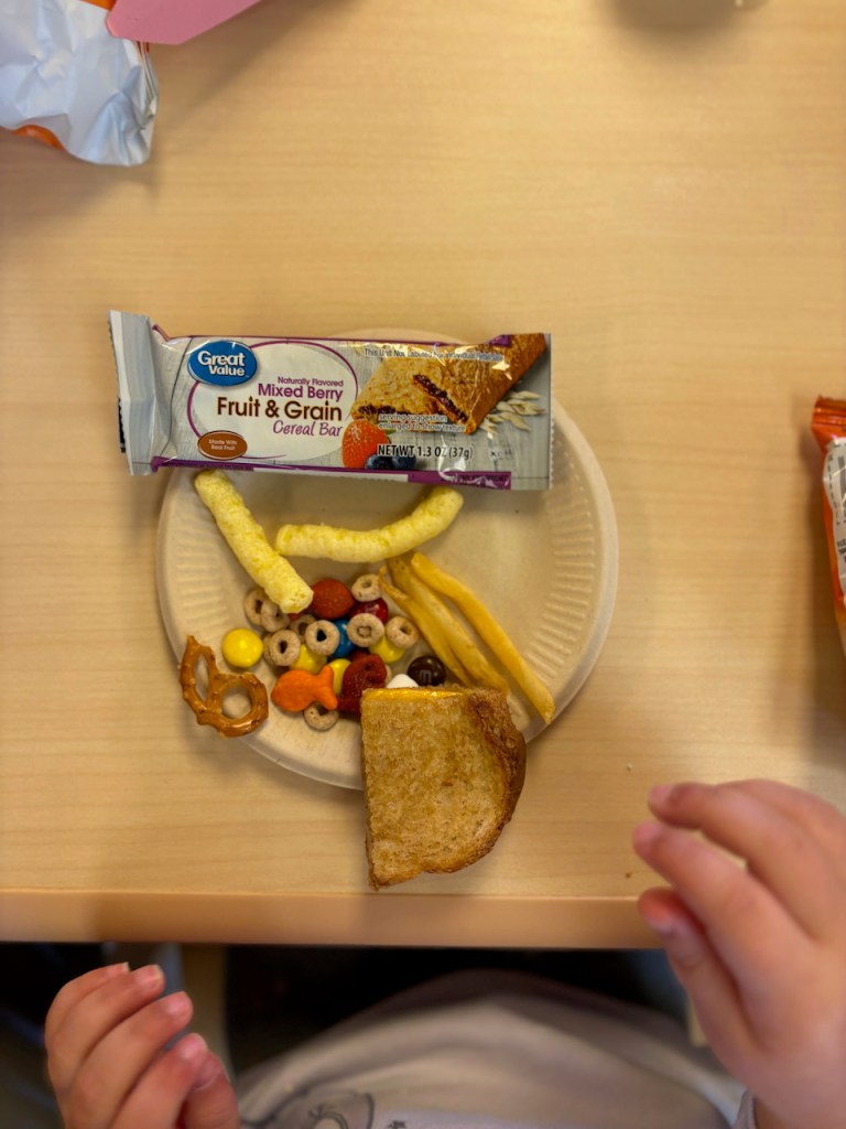 In the morning we had french fries, grilled cheese, party mix, cheetos and grain bars. Delicious!