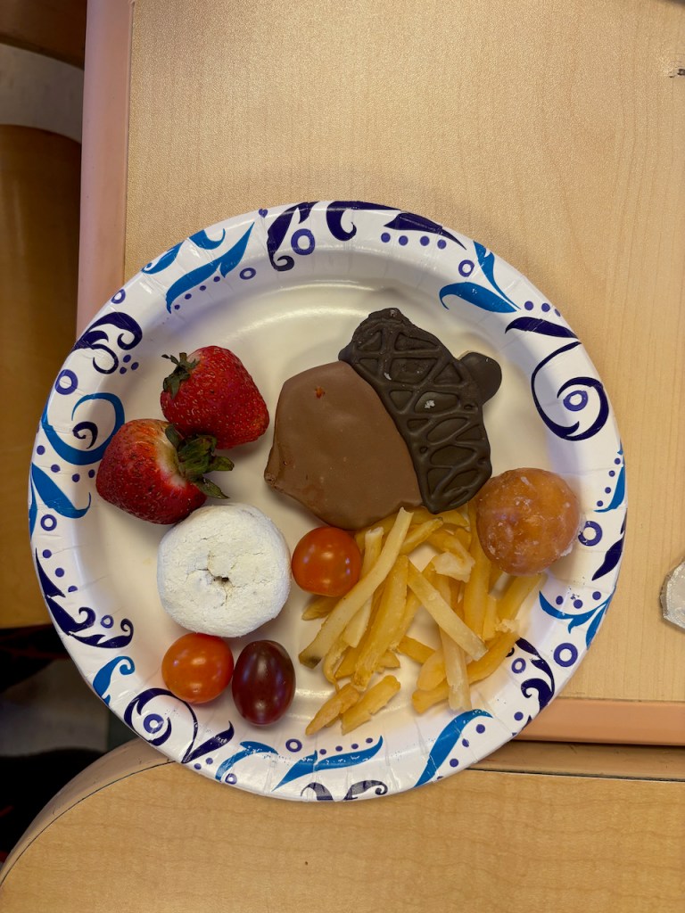 In the afternoon we had french fries, tomatoes in fall colors (not only red), strawberries, donuts, donut holes, fancy cookies and yogurt smoothie drinks. Thank you for the feast, friends!