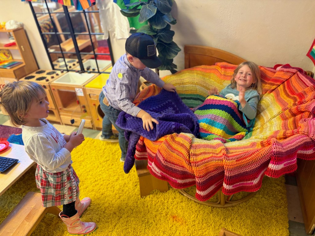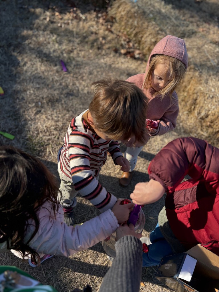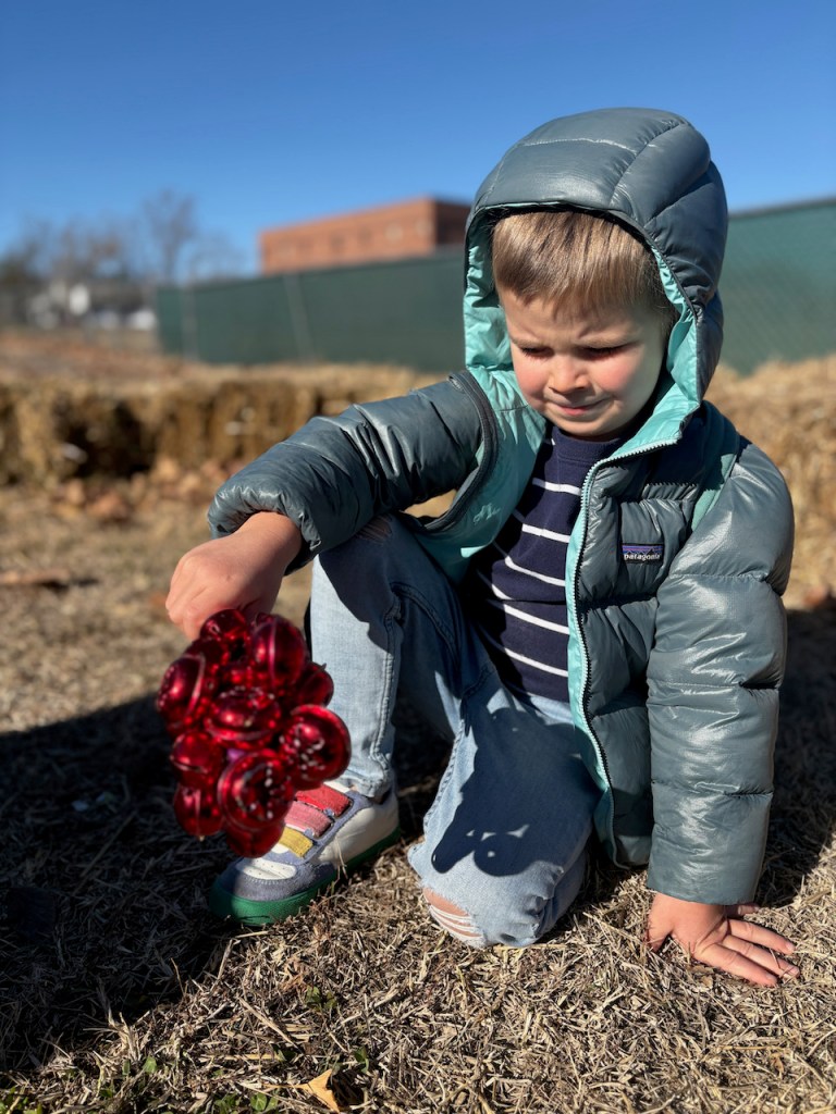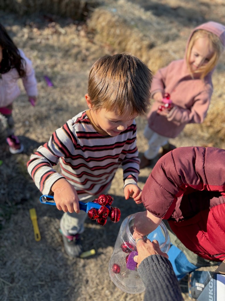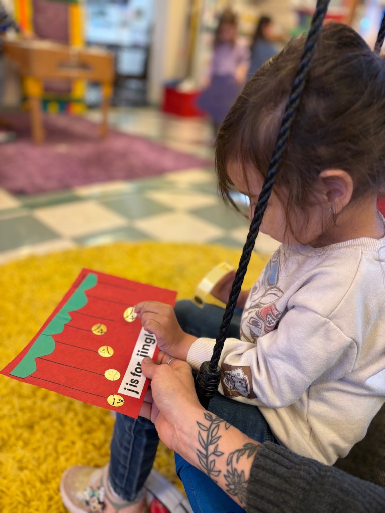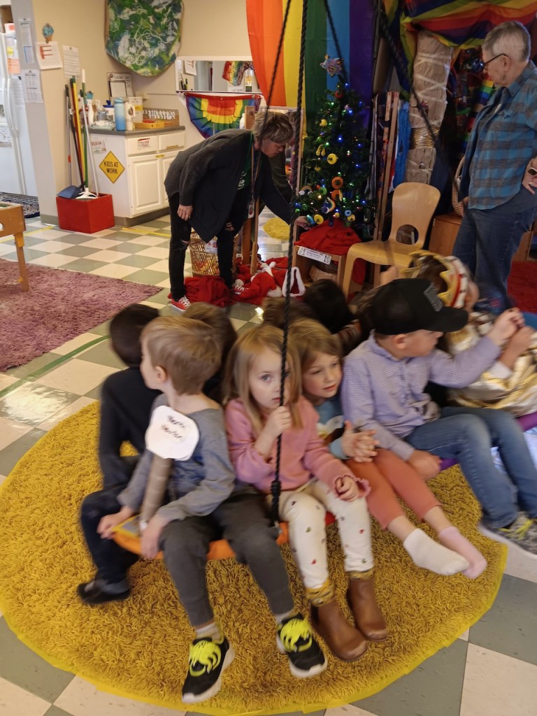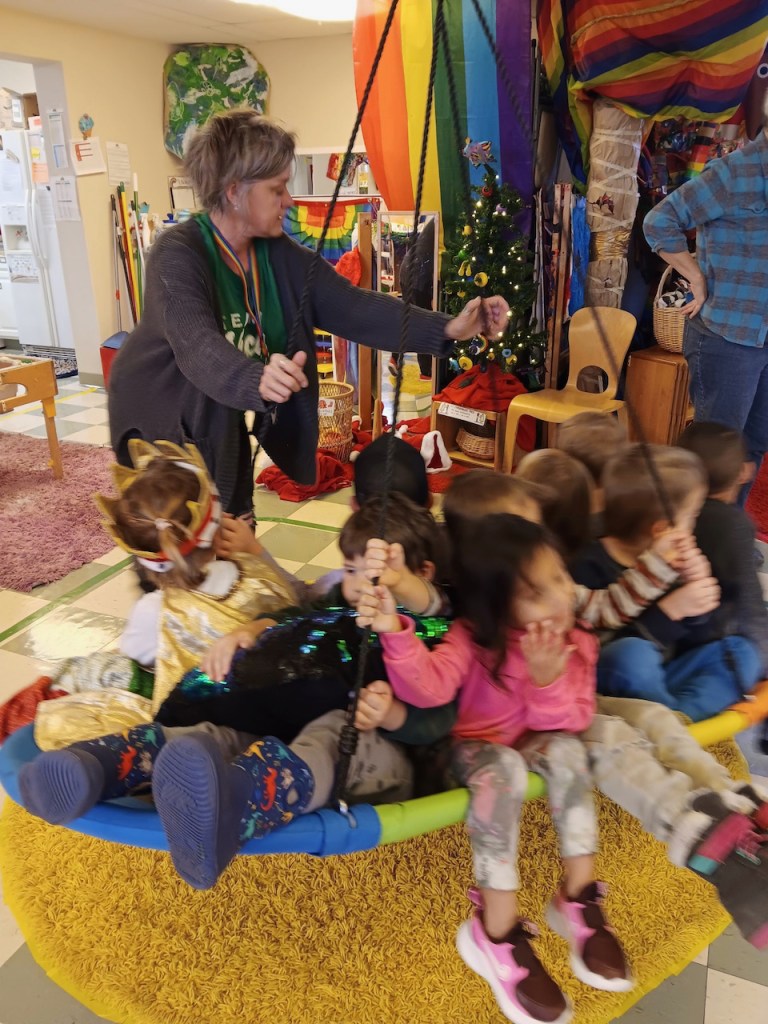 This week is all about welcoming December, jingle bells inside and out, candy canes, baby Jesus and jumping! The classroom is decorated and the Dirt Pumpkin sprouted 3 more pumpkin plants over night! We get out the big swing sometimes when requested and this afternoon was one of those days. Read on to learn more about our play today.
