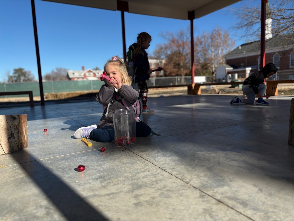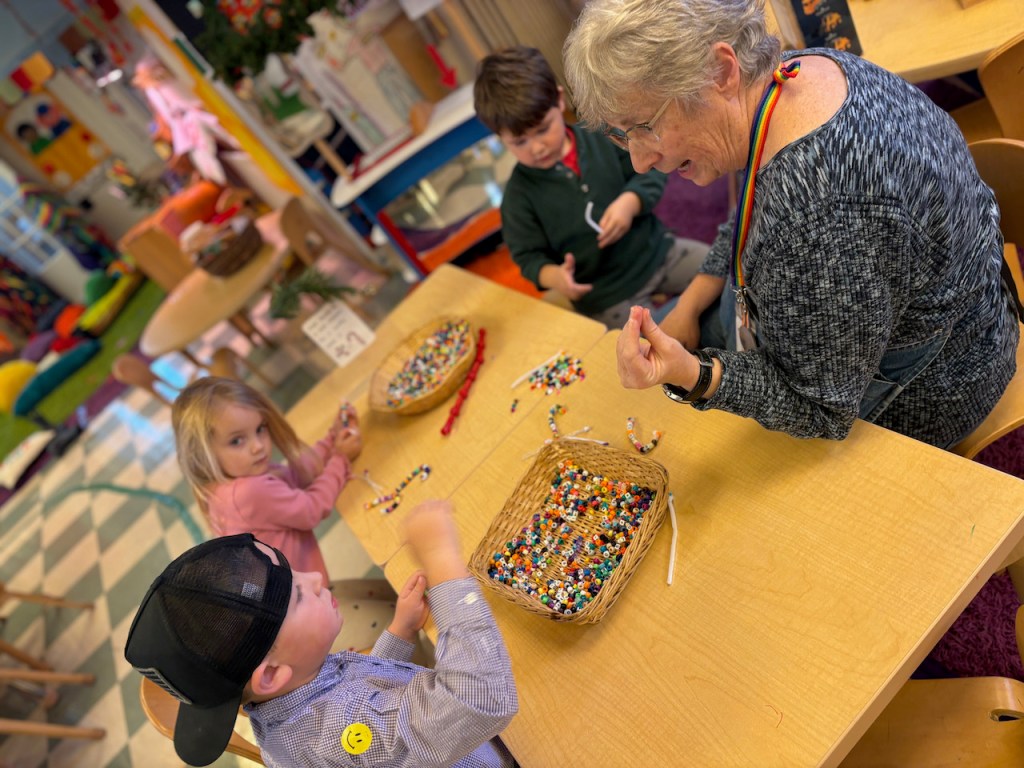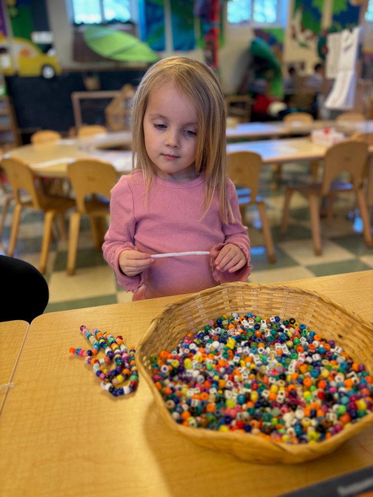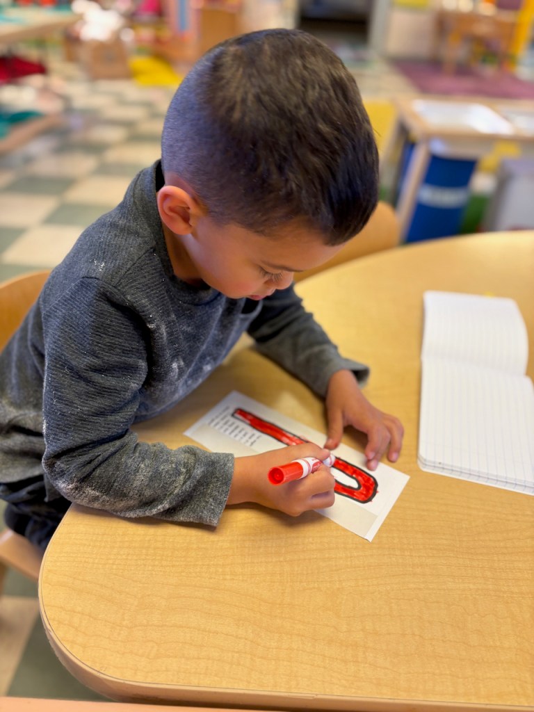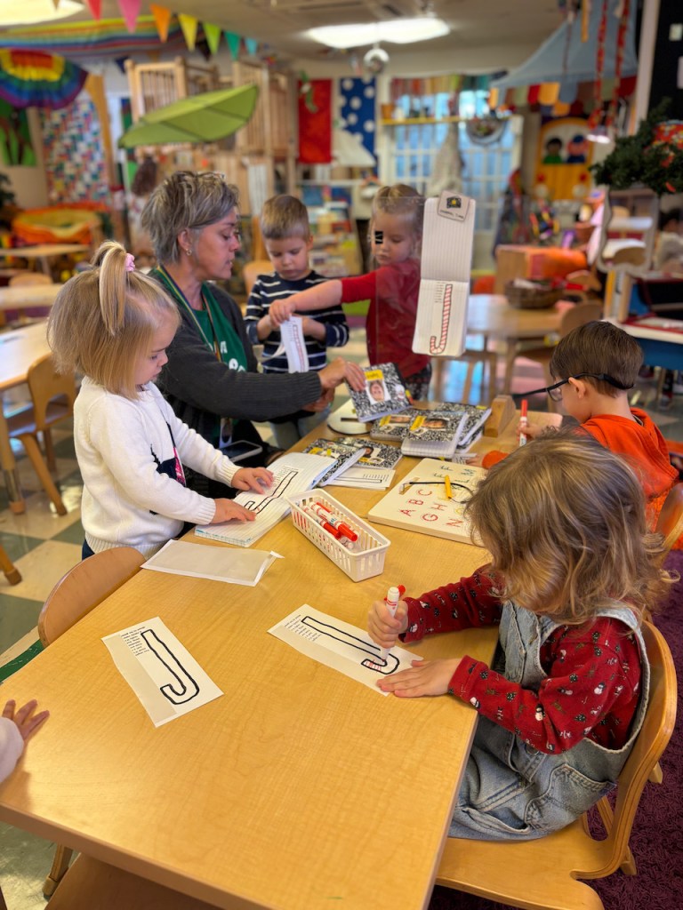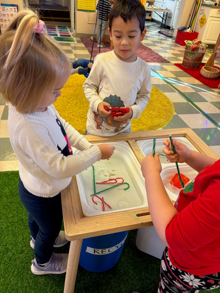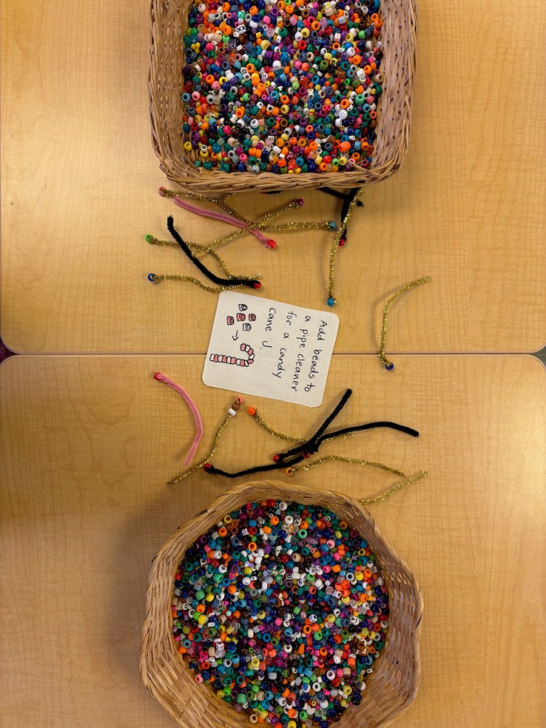 We have our Alphabet Friend, Joey the Jokey J who is dressed up as a candy cane. We have pretend candy canes in our Water Table with mint water. There are beads and pipe cleaners for candy cane J ornaments all week. Joey loves all of those areas!