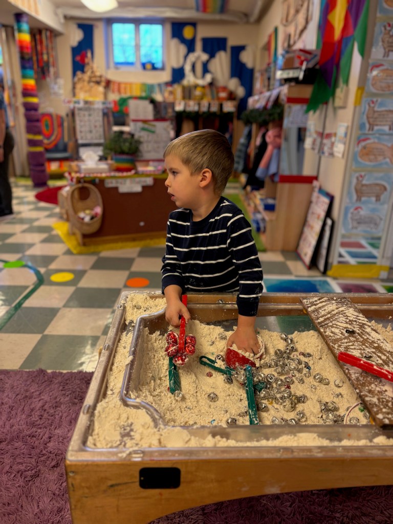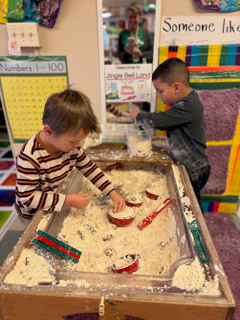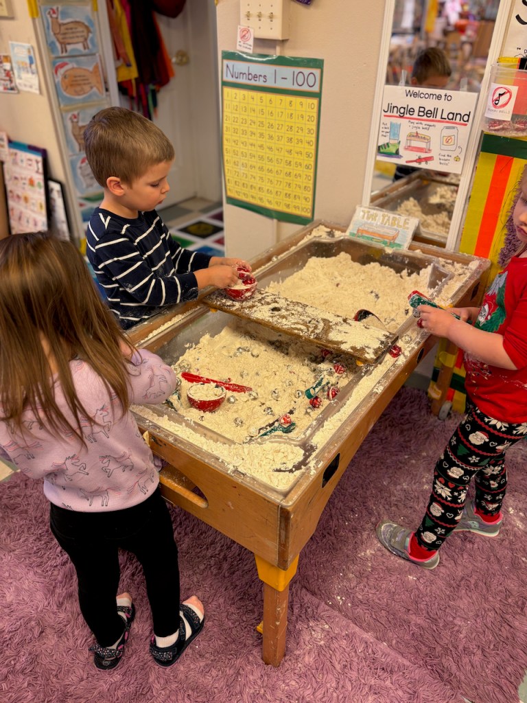 We have jingle bells in the Cloud Dough along with magnets, including a tub for any broken bells which slows down the play as children pause to shake and listen for the sound. We also have a set of outdoor jingle bells and magnet wands.