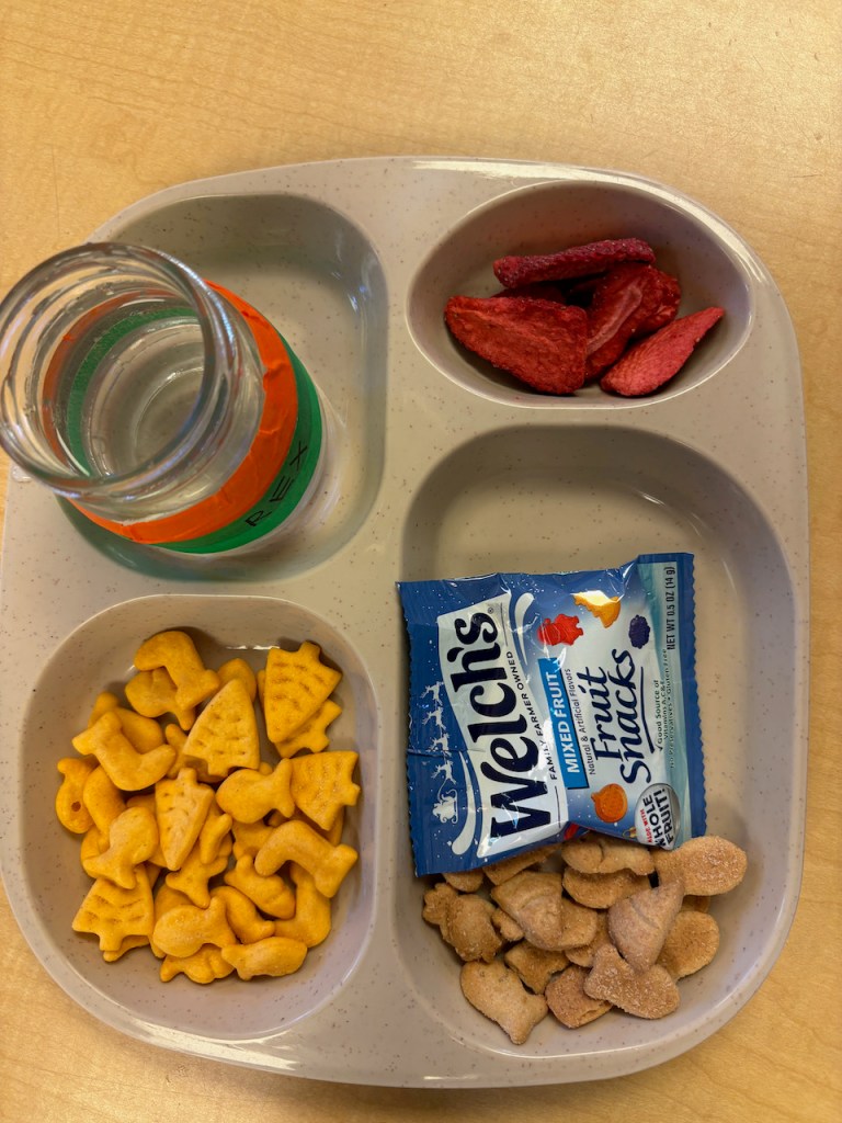 In the morning we had Juicy Juice boxes, jelly jam filled muffins and colby jack cheese from Millie. In the afternoon we had Christmas fruit snacks, freeze dried strawberries and 2 kinds of Christmas goldfish crackers from Owen. Thank you so much friends!