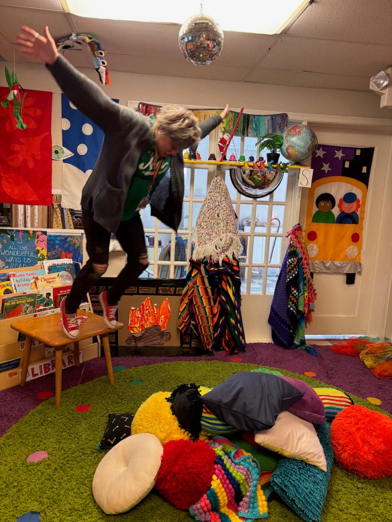 We decided he could have jumped, climbed or gotten a ladder. We imagined if he had jumped and then had the option of jumping off the table like he would have from the tree! Ms Kristin demonstrated first: