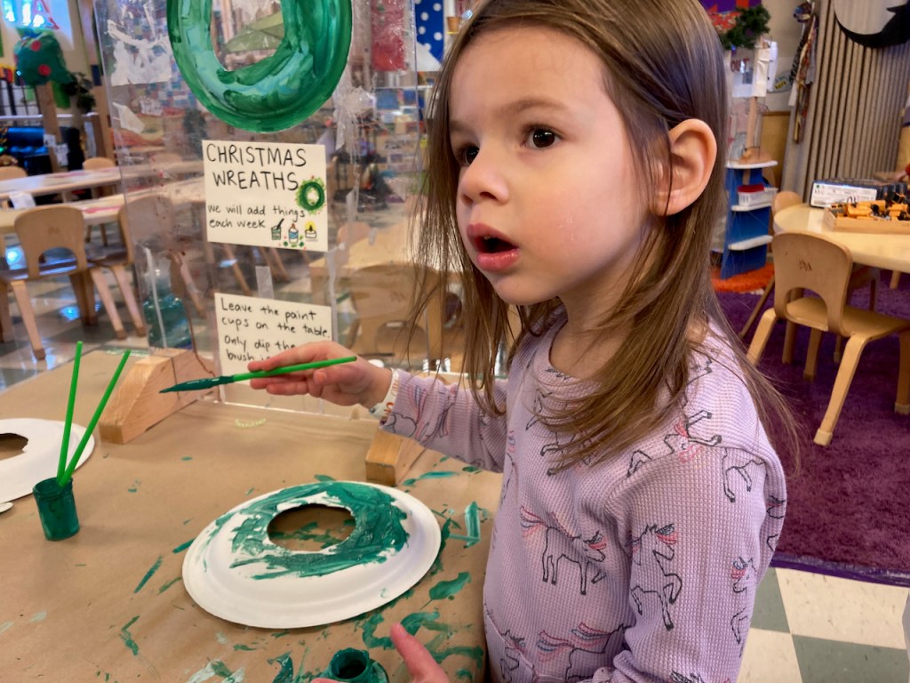 Christmas Wreaths: our project for the month is adding layers to our Christmas wreath. This week we are painting the base layer with different shades of green.