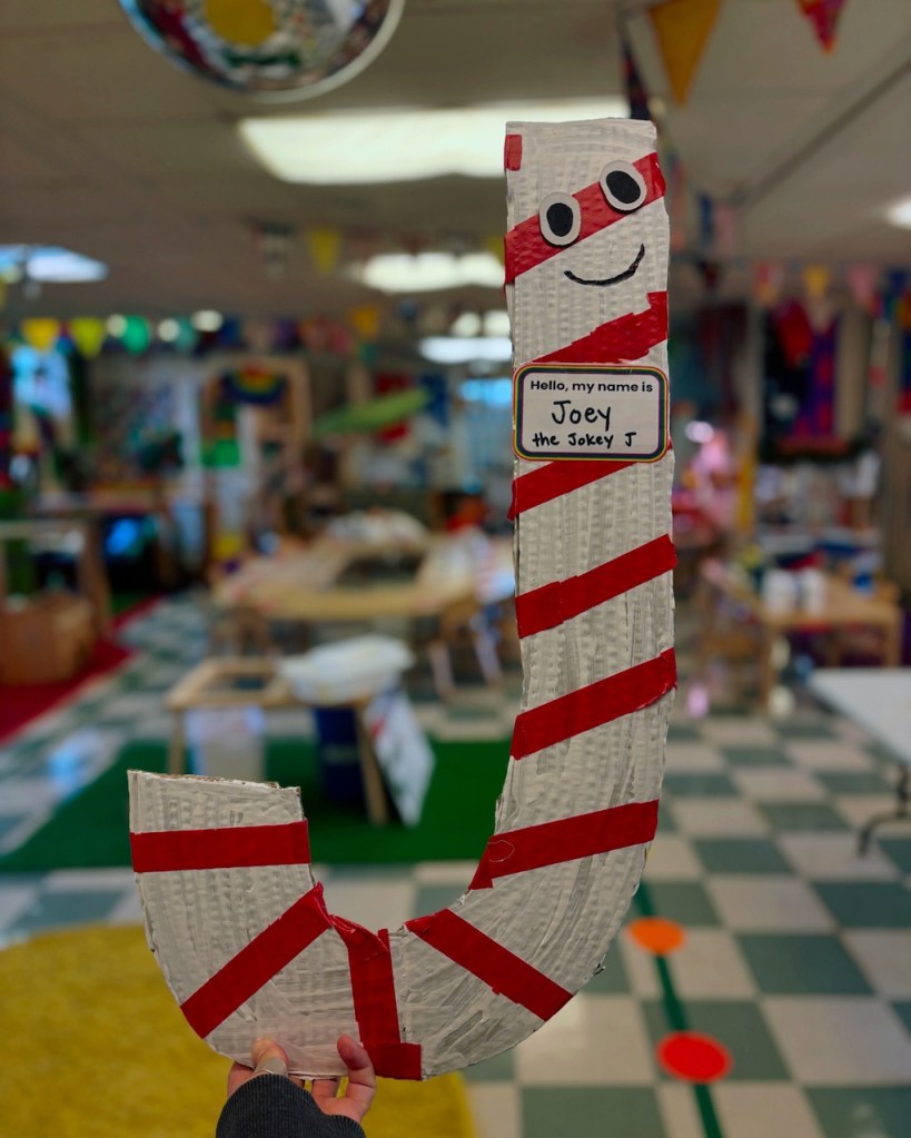We have our Alphabet Friend, Joey the Jokey J who is dressed up as a candy cane. Today children could make Joey the J babies and take them home. They are so sweet.