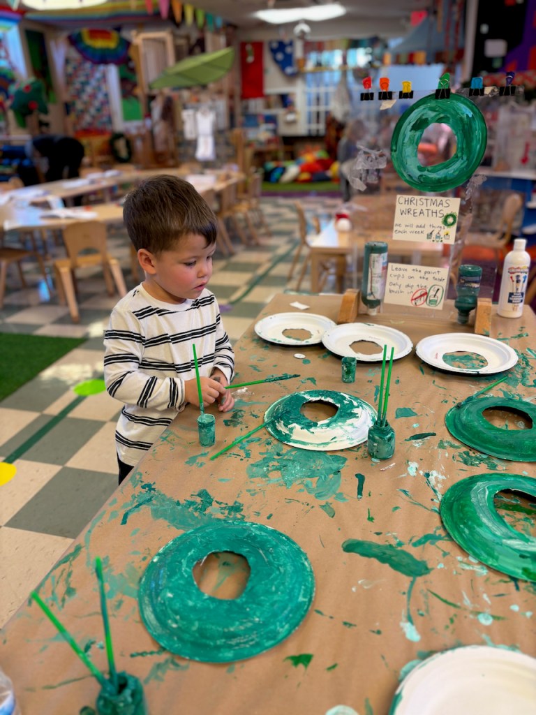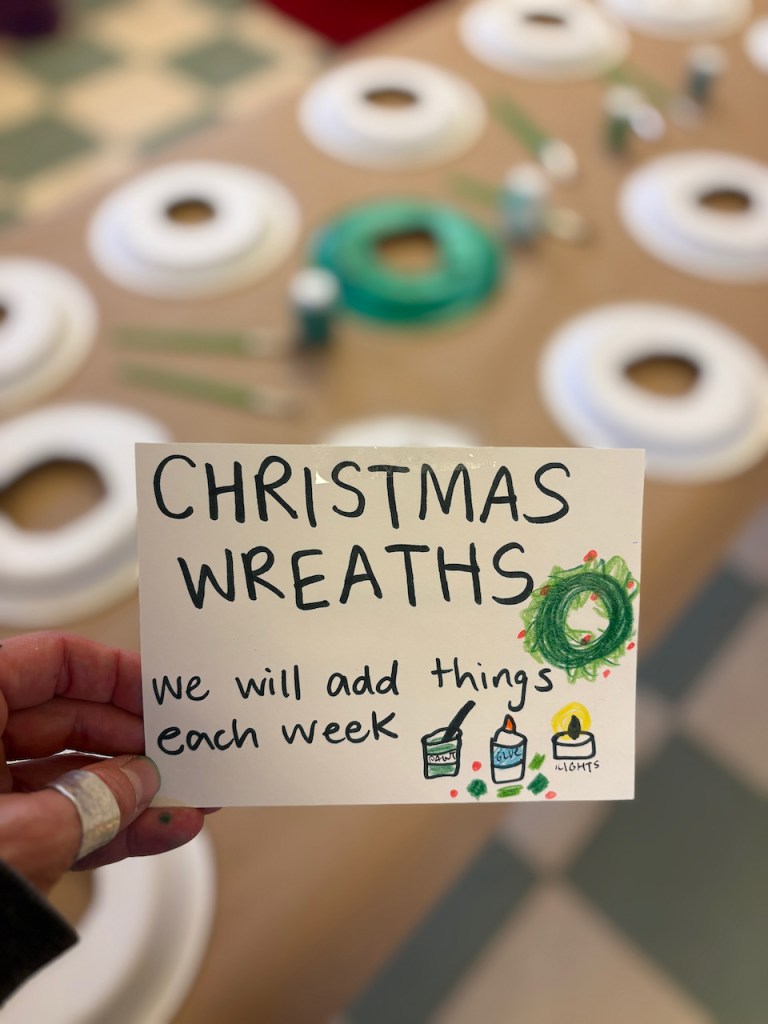 Christmas Wreaths: our project for the month is adding layers to our Christmas wreath. This week we are painting the base layer with different shades of green and different types of paint.