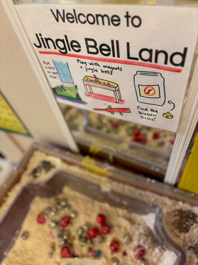 We still have jingle bells in the Cloud Dough along with magnets, including a tub for any broken bells which slows down the play as children pause to shake and listen for the sound.