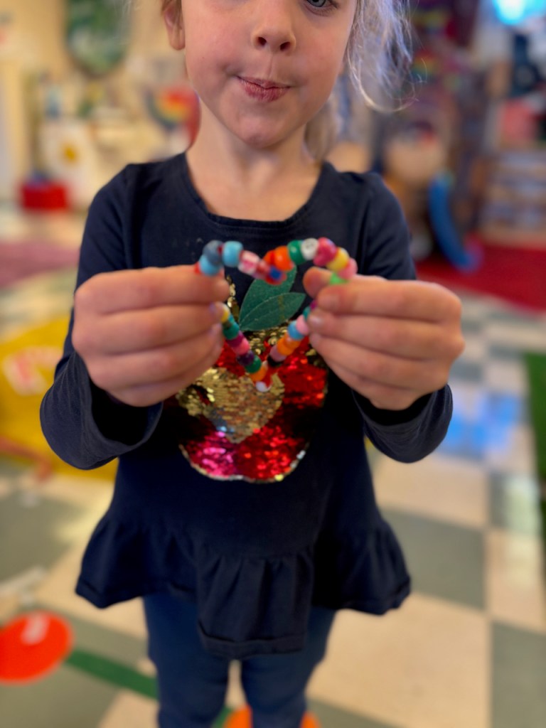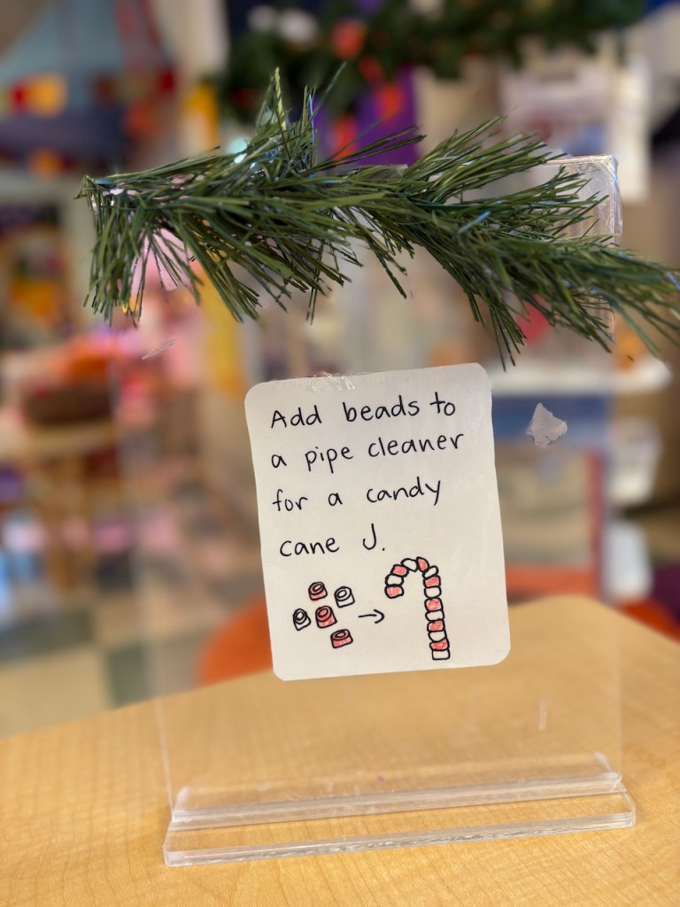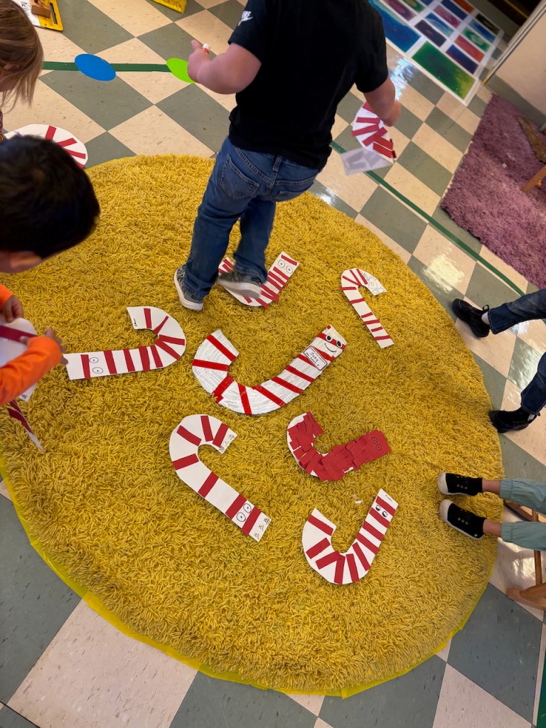We have pretend candy canes in our Water Table with mint water. There are beads and pipe cleaners for candy cane J ornaments all week.