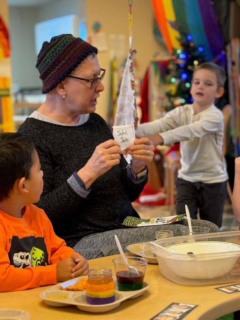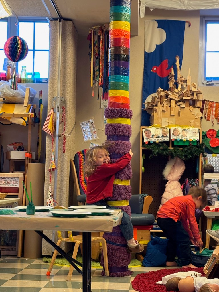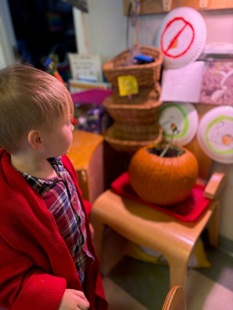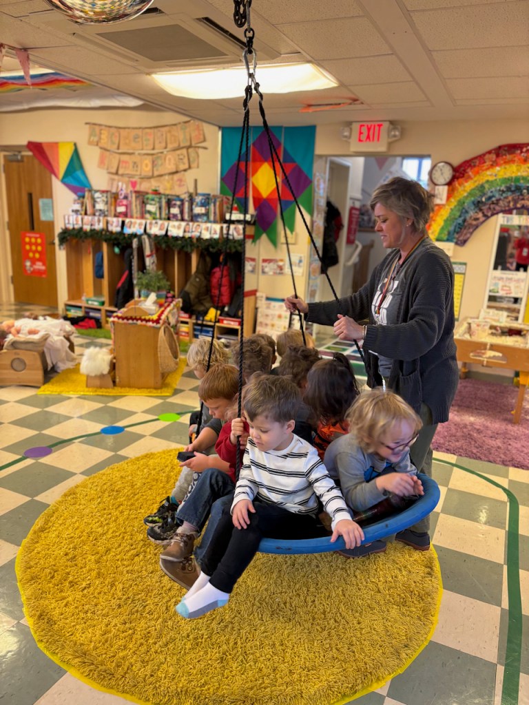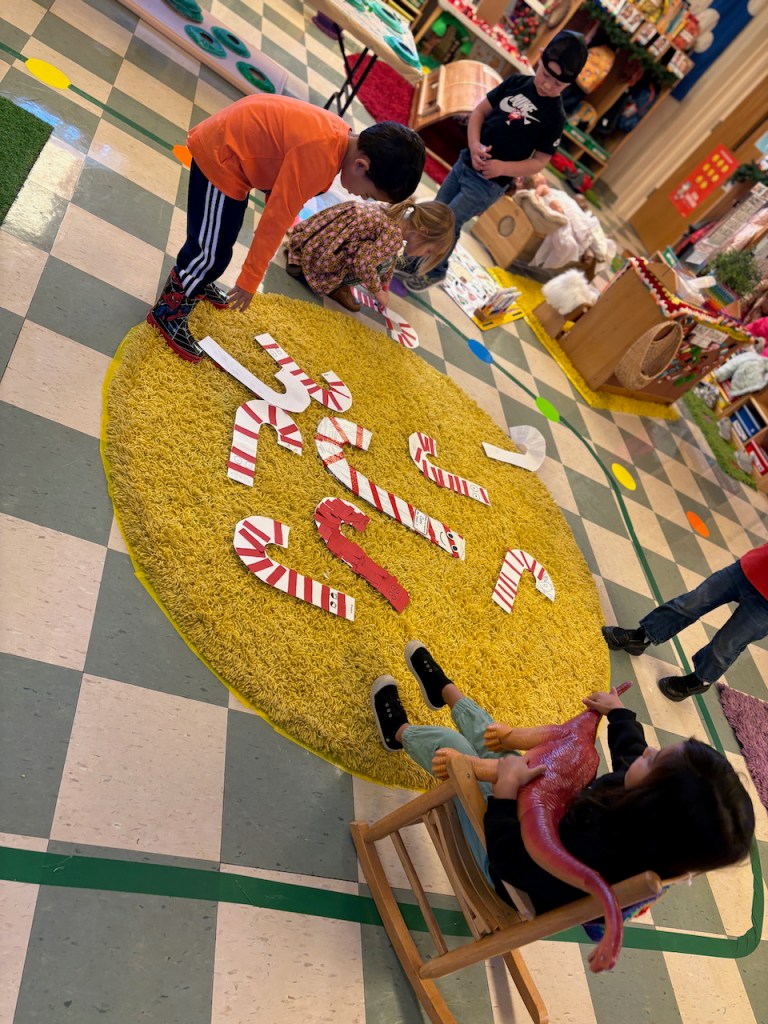 This week was all about welcoming December, jingle bells, candy canes, baby Jesus and jumping! The classroom is decorated and the Dirt Pumpkin continues to grow! We are up to 11 sprouts! We ended both sessions with big swing time (it’s one of the best group activities especially when I sing made up verses to Jingle Bells and take breaks to clean up any messes the children can spy from the swing). Read on to learn more about our play today.