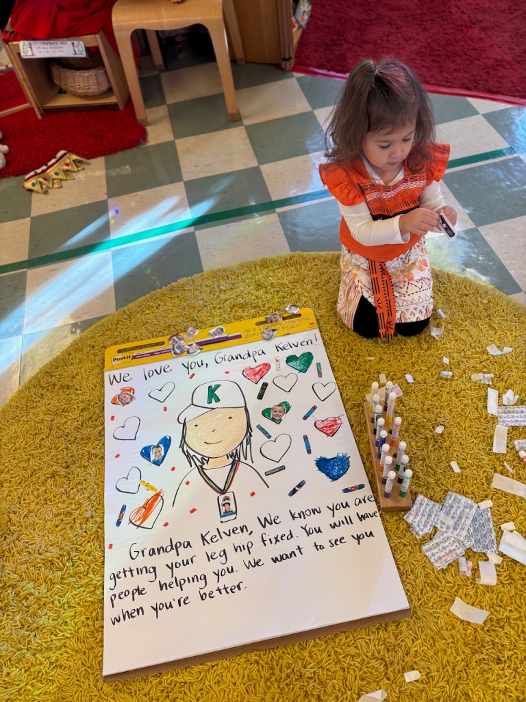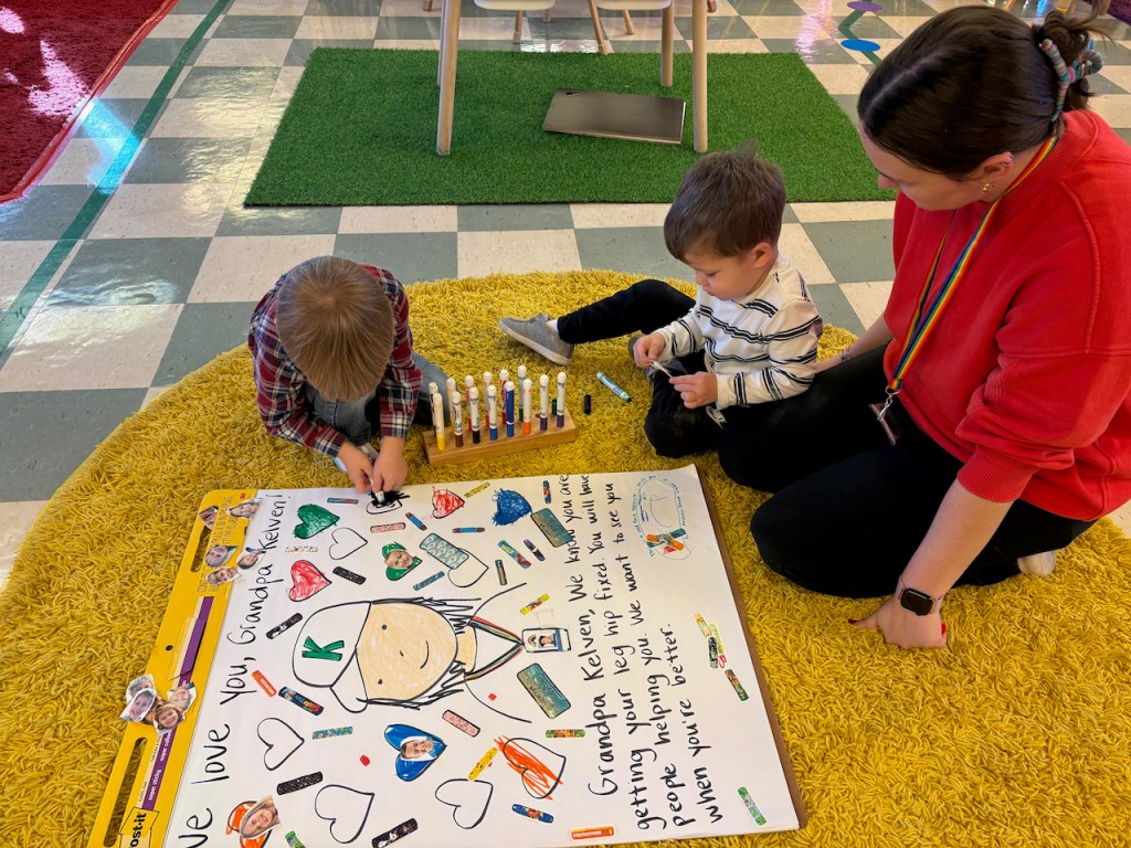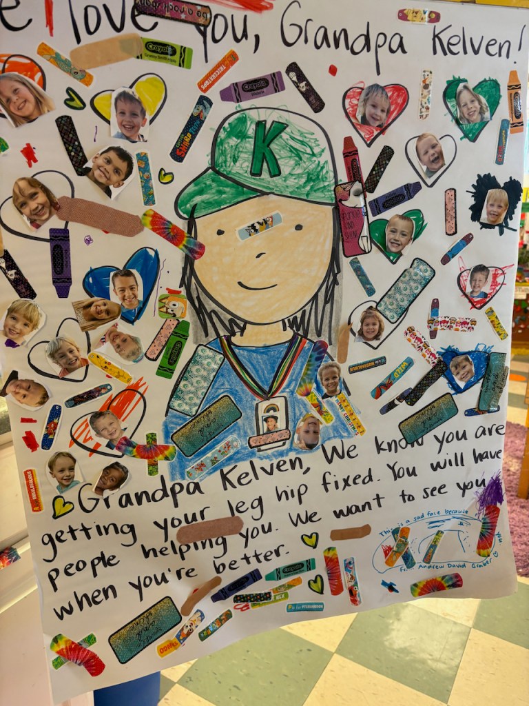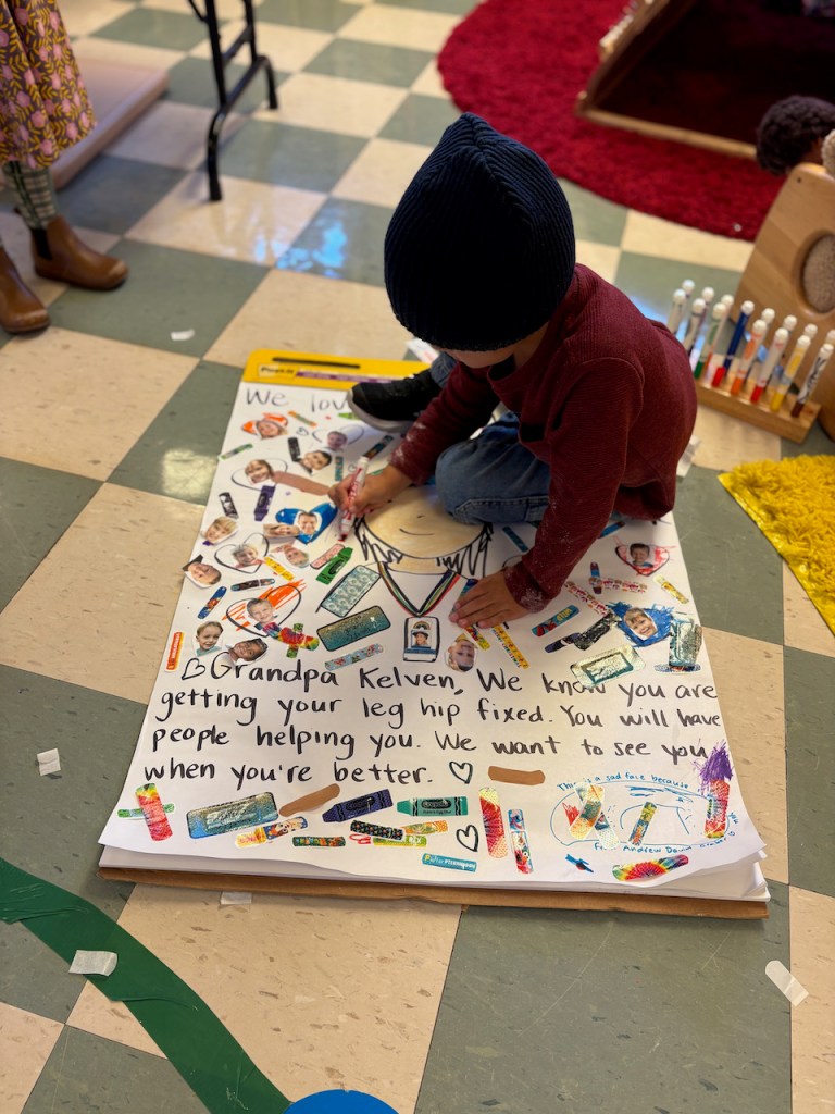 Grandpa Kelven! We worked hard on his Get Well poster today and made up songs about him to the tune of Jingle Bells. Fun fact that the children know: Grandpa Kelven and Ms Brenda are married so she will deliver him his poster.