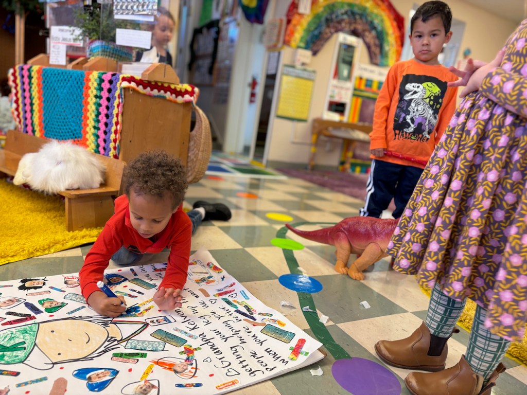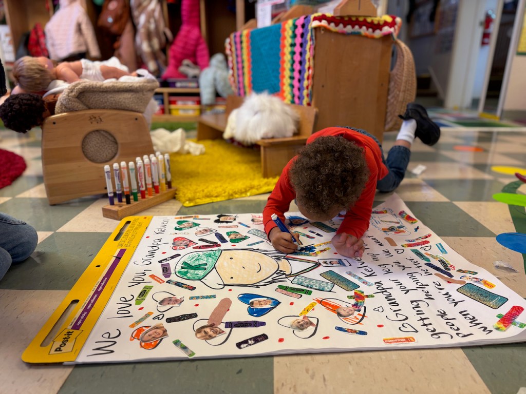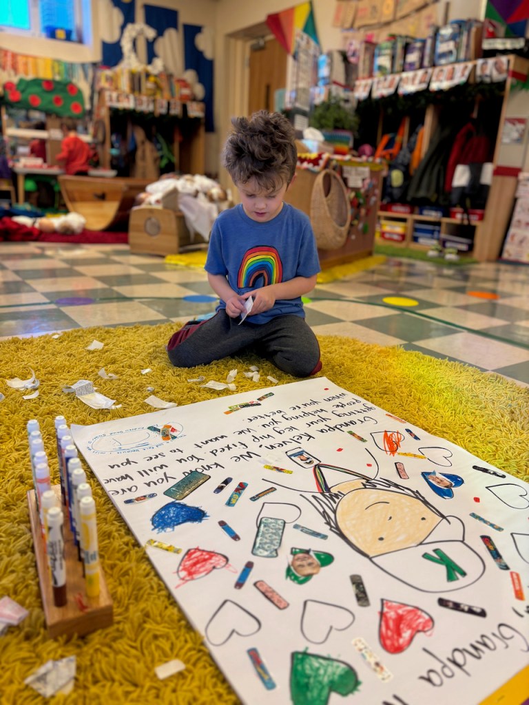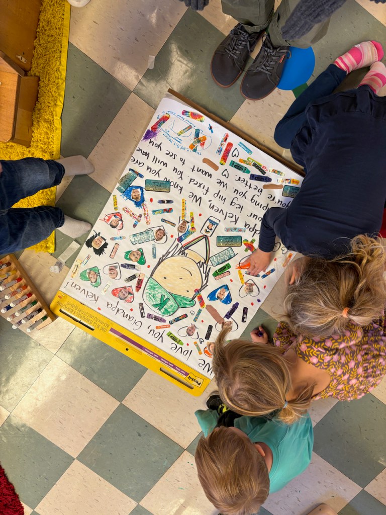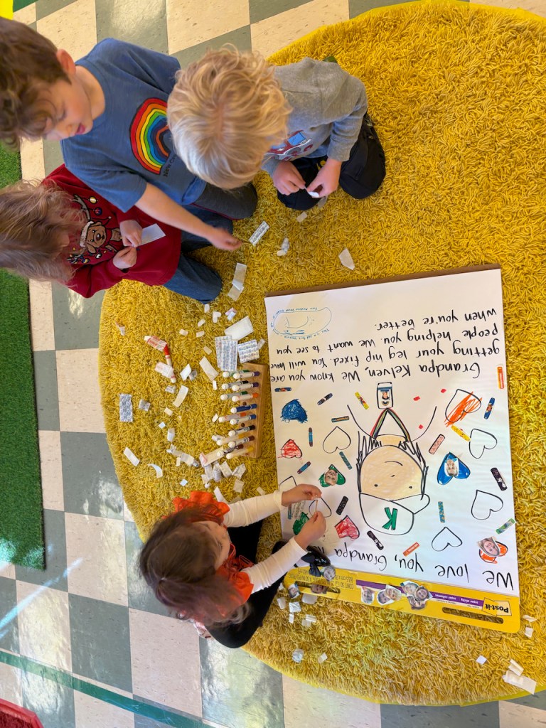 Grandpa Kelven! We worked hard on his Get Well poster today and made up songs about him to the tune of Jingle Bells. Fun fact that the children know: Grandpa Kelven and Ms Brenda are married so she will deliver him his poster.