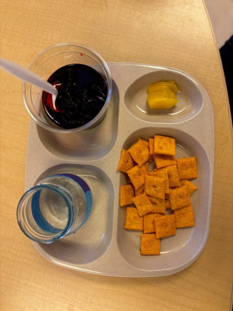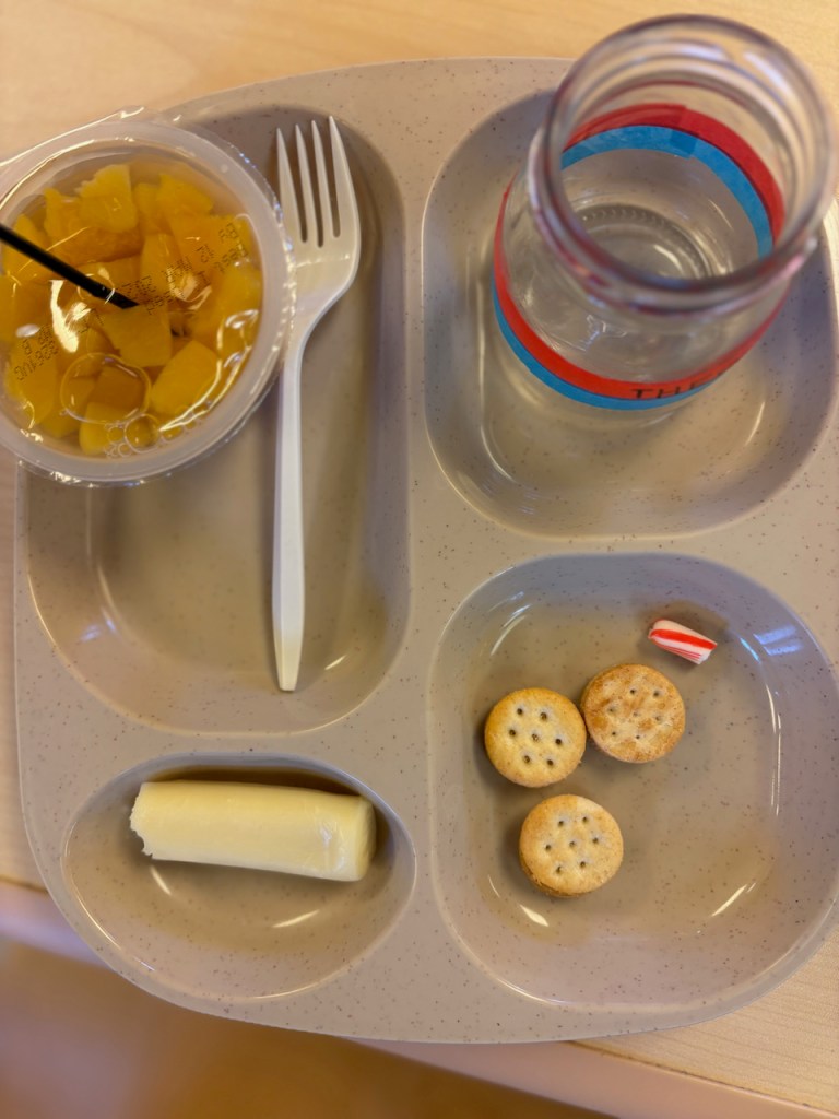 In the morning we had fruit cups (and drank the juice with a straw first), crackers with peanut butter and cheese. In the afternoon we had Joyful Jello, jack fruit and colby jack Cheezits from Malcolm…thank you!!