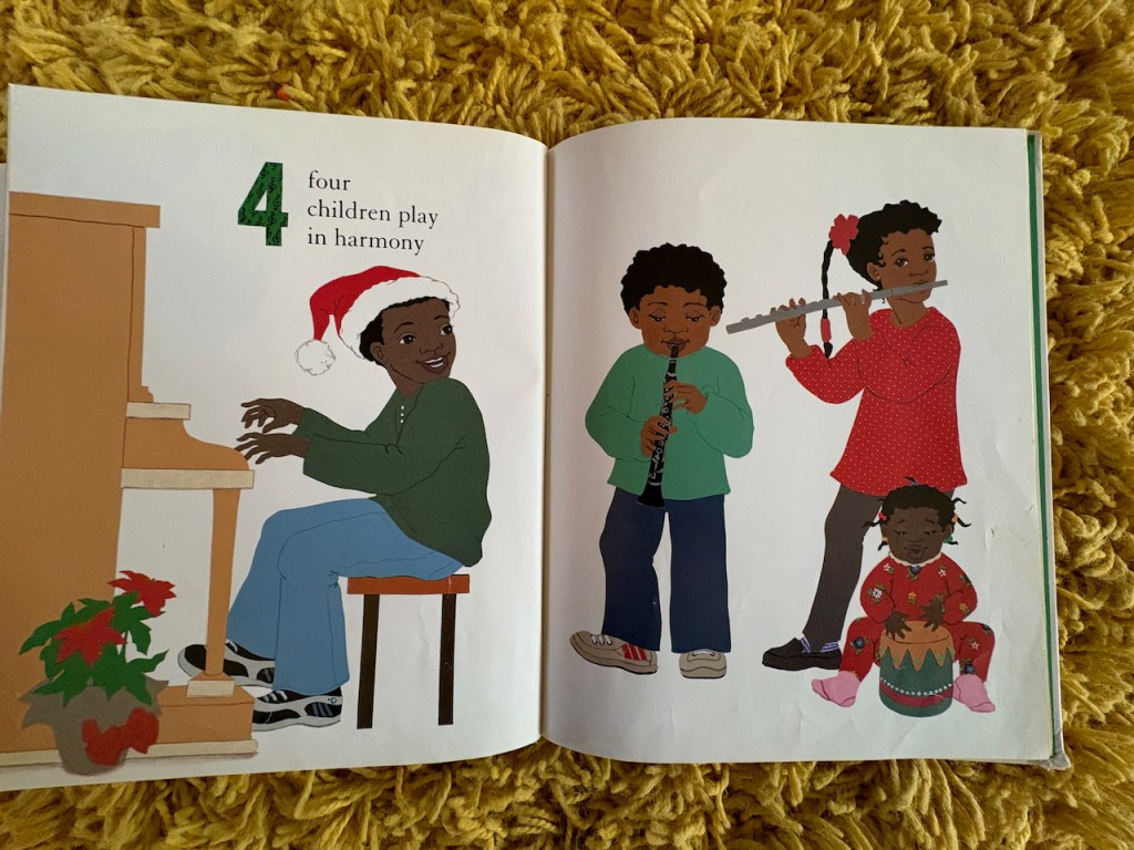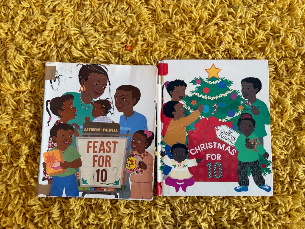 Today we found the same baby from our Feast for Ten book is back for the Christmas for Ten book! Sweet baby. In the Thanksgiving book she fell asleep, in the Christmas book she played a drum (we pretended to be her playing a drum).