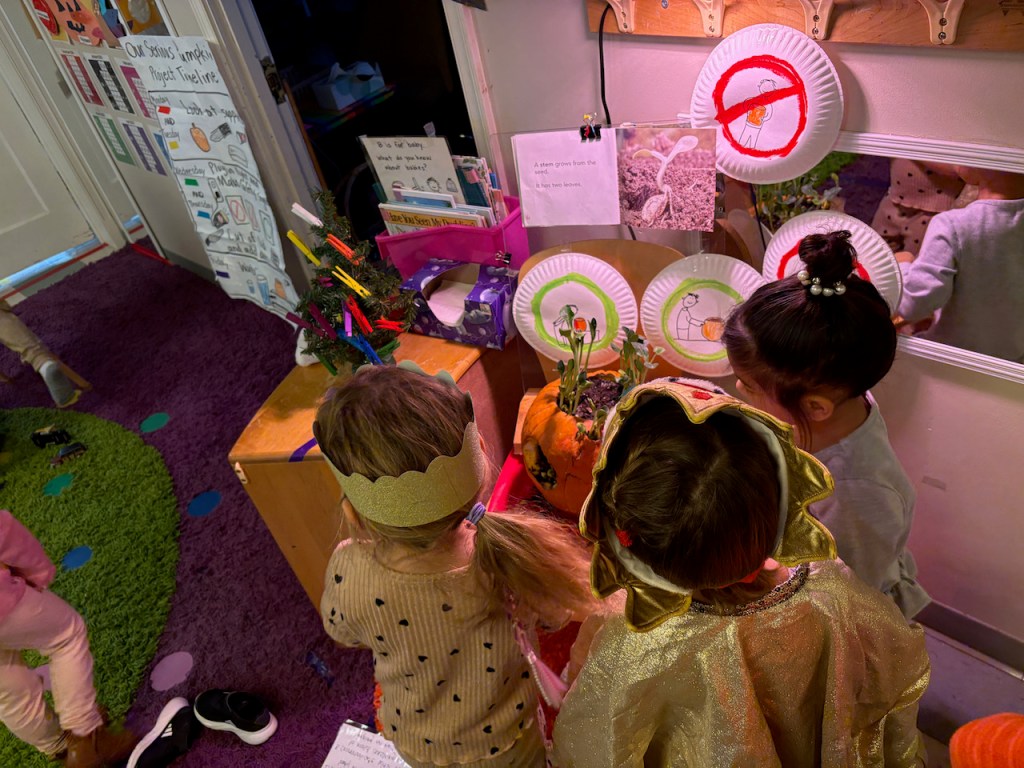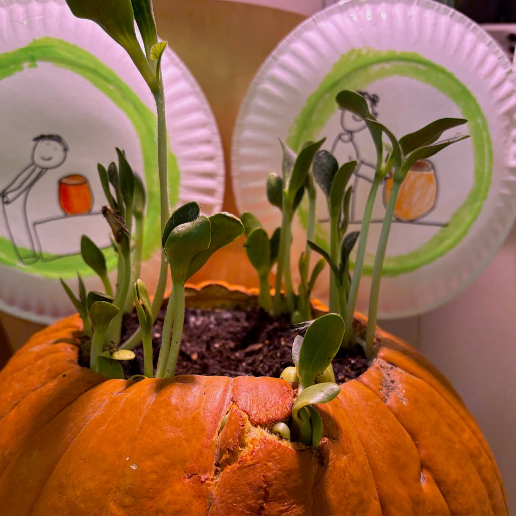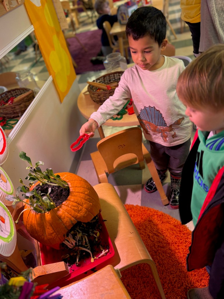 Dirt Pumpkin: This has been a very exciting addition to the classroom. After a couple of weeks of no action above the dirt, we are up to many plants-and one that even broke through the rind of the pumpkin! We cut 2 holes in the pumpkin and discovered many more plants!